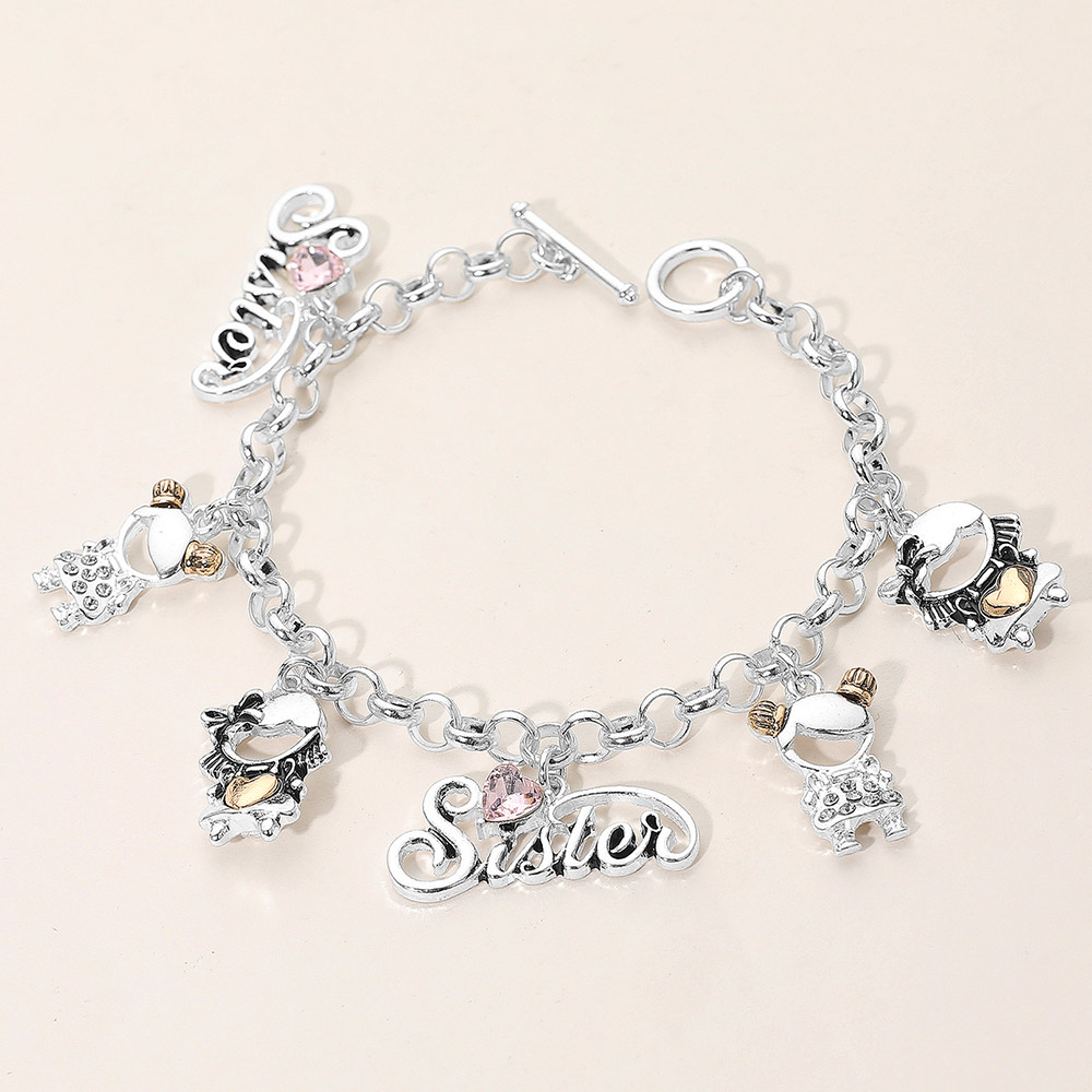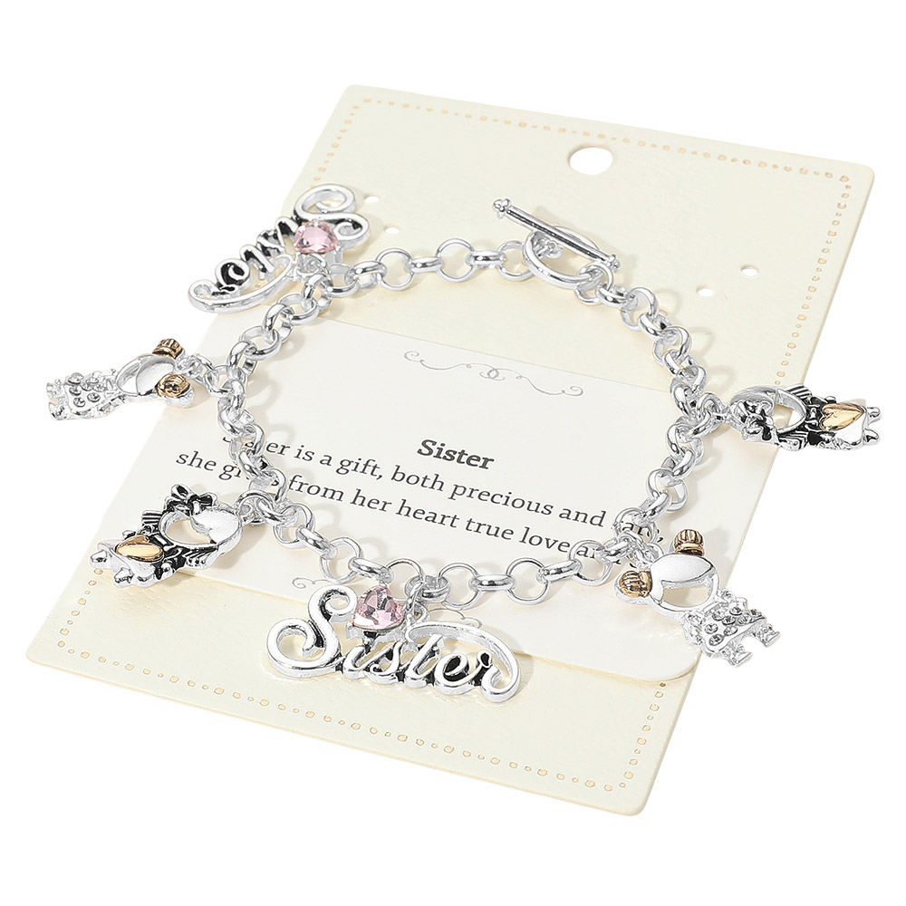Details • Size : 1.2" H, 8" L • Toggle Closure • Celebrate sisterly bonds with this charm link bracelet featuring playful letter accents and symbolic hanging details. Designed for everyday elegance and meaningful gifting, it offers comfortable wear and timeless appeal, perfect for birthdays, holidays, or expressing appreciation. • Lead and Nickel Compliant
