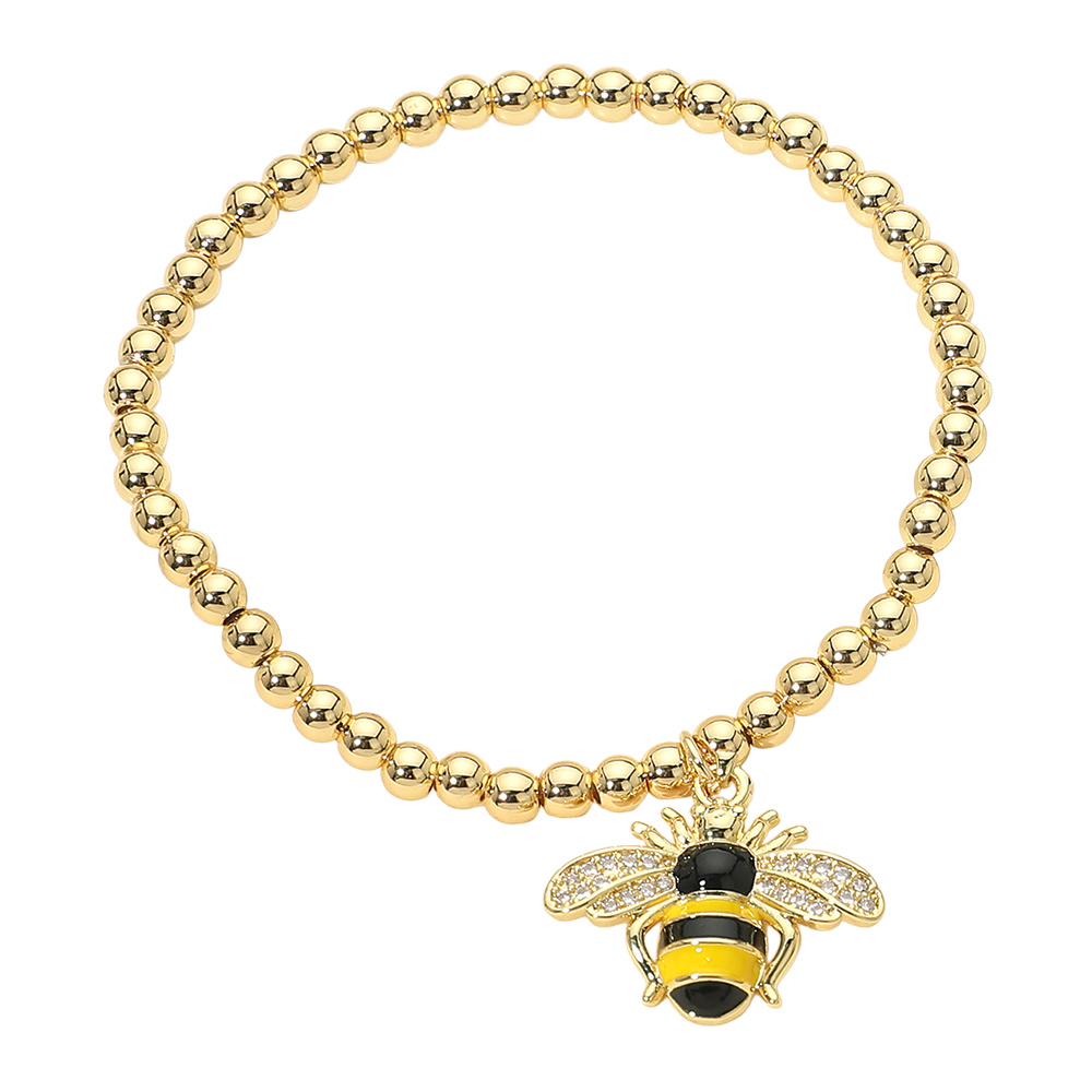 Stainless Steel CZ Stone Paved Enamel Honey Bee Charm Beaded Stretch Bracelet