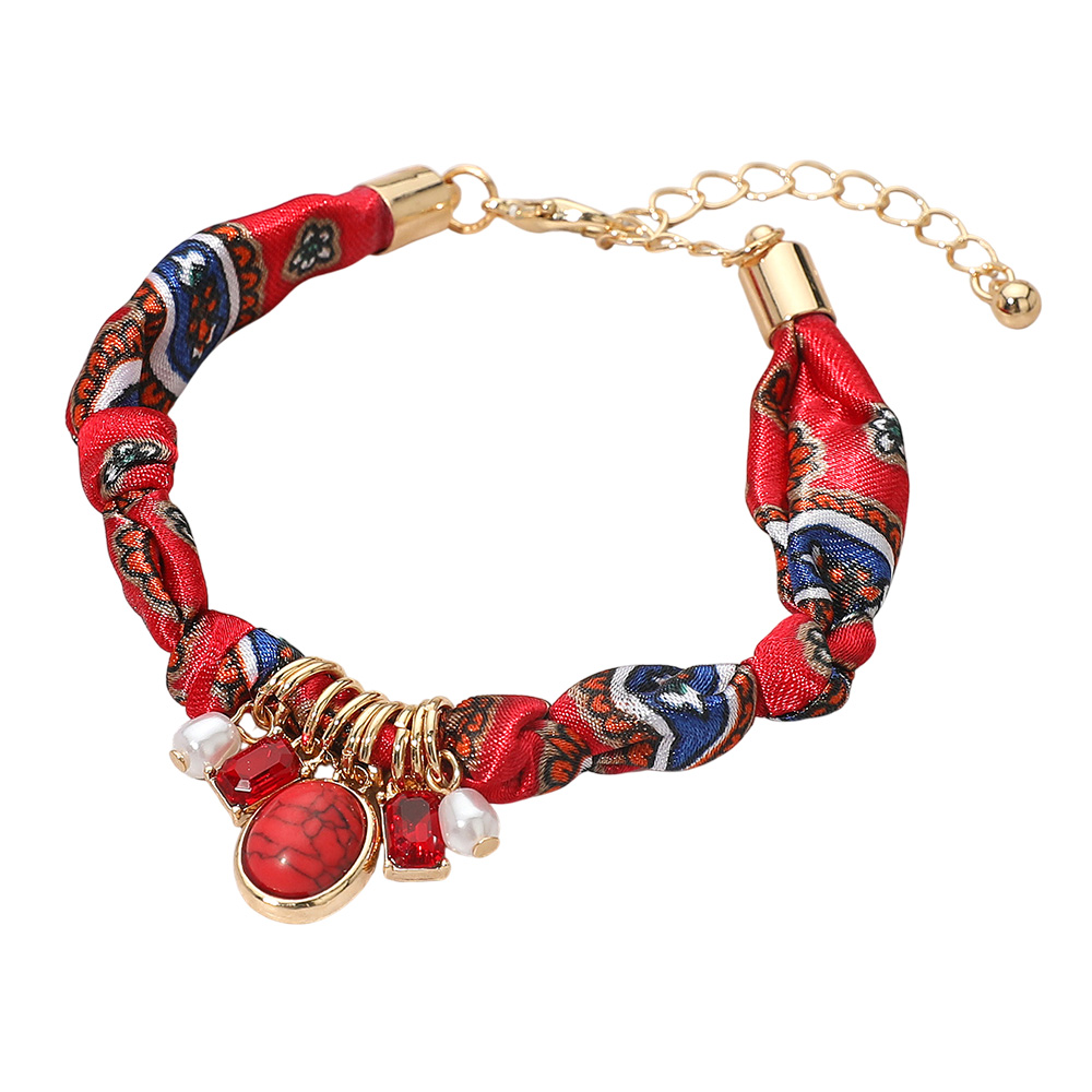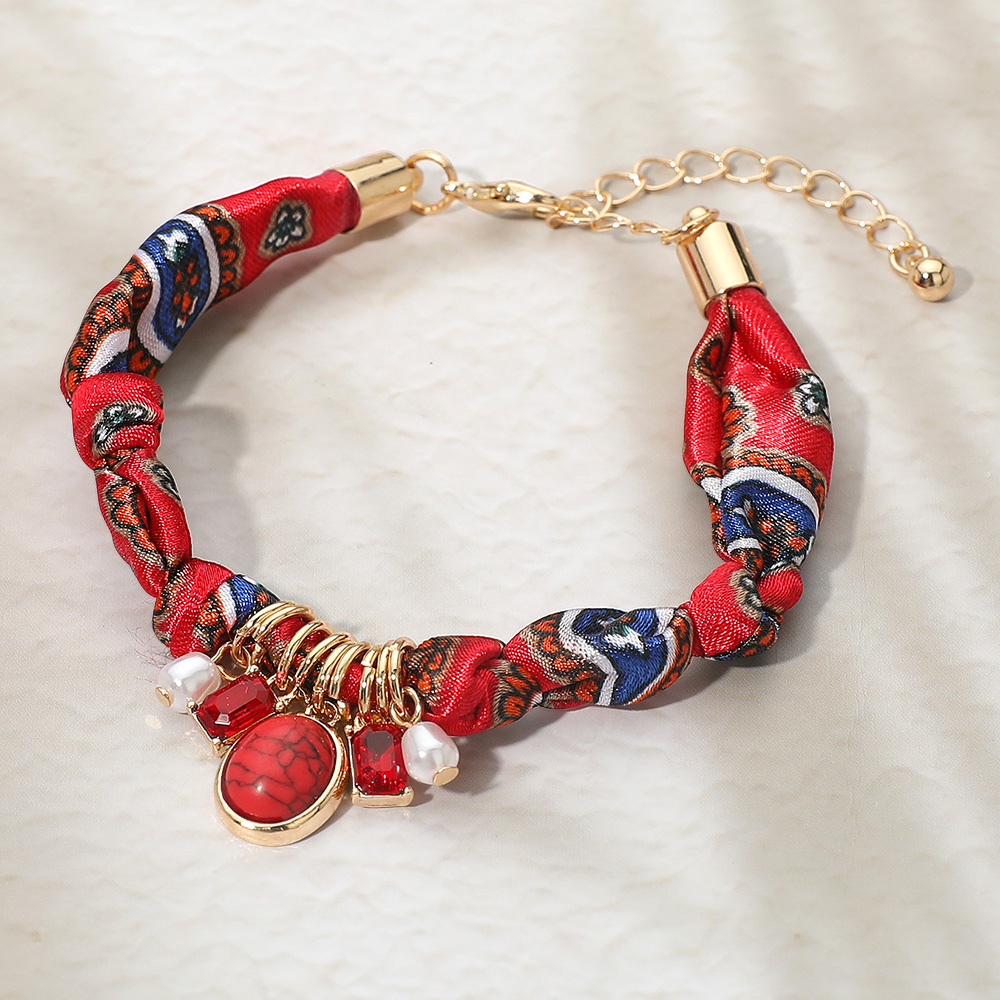 • Vibrant fabric-wrapped bracelet adorned with dangling charms and gem-like accents. A bold and stylish piece that blends bohemian flair with modern fashion, perfect for adding personality to casual or dressy outfits.