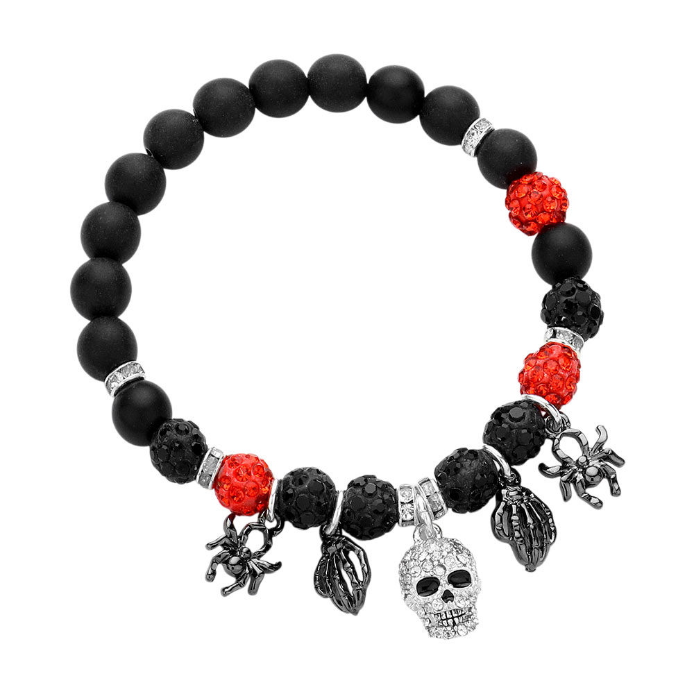 • Stretch bracelet with matte and textured beads, adorned with gothic charms including skulls, hands, and spiders. A bold Halloween-inspired accessory that brings edgy, spooky style to any outfit.