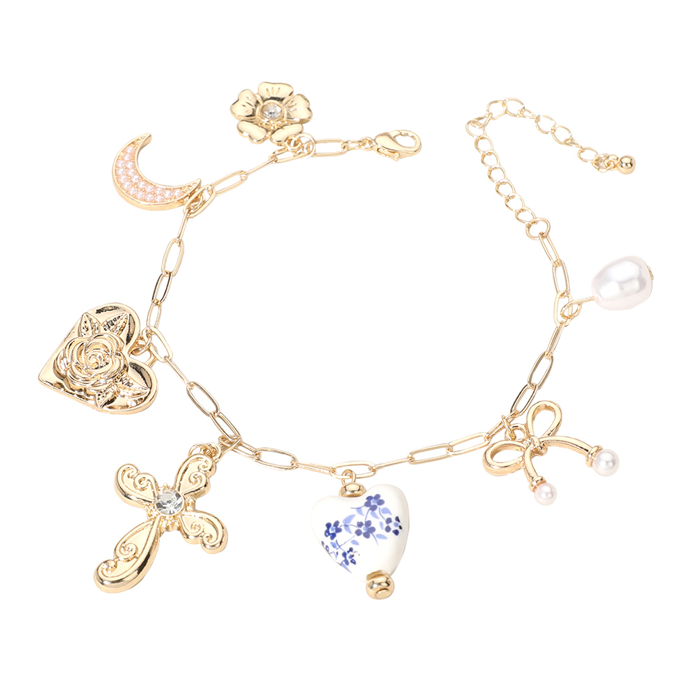 Stone Pointed Cross Flower Pearl Crescent Bow Ceramic Heart Charm Station Paperclip Chain Bracelet