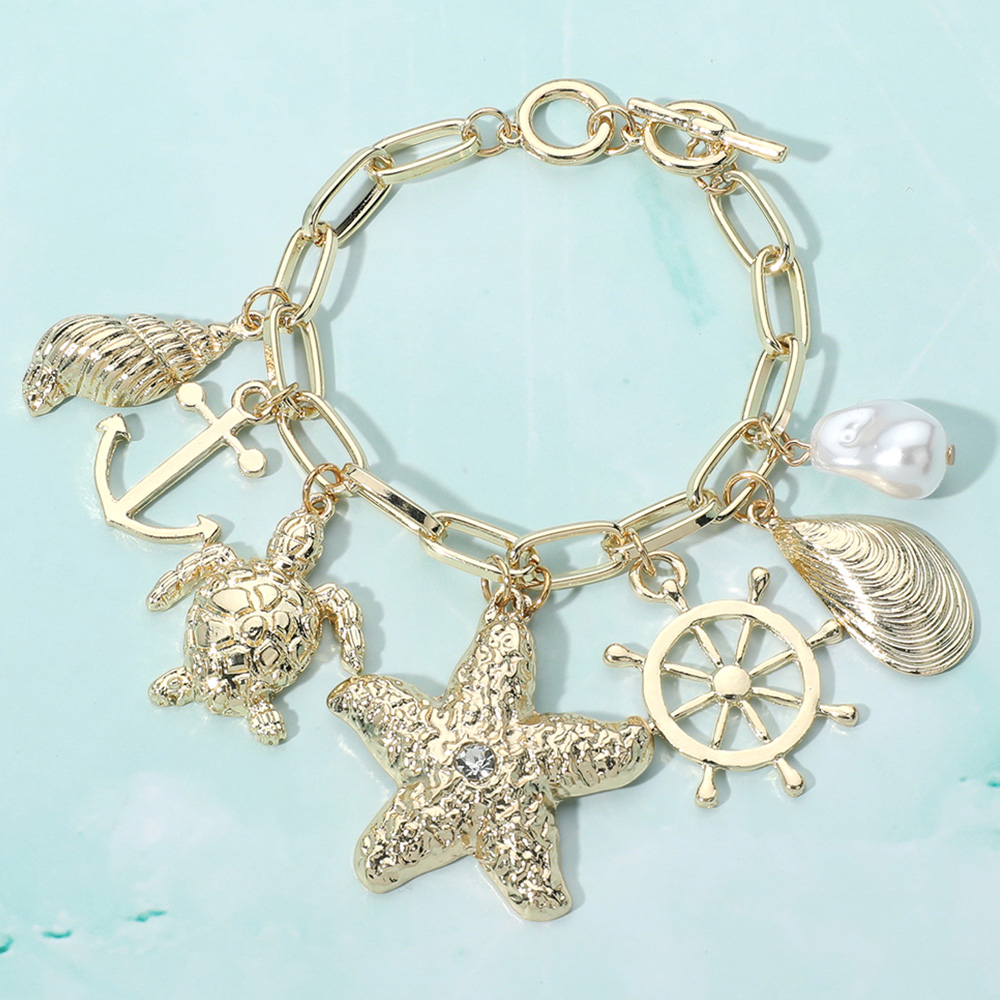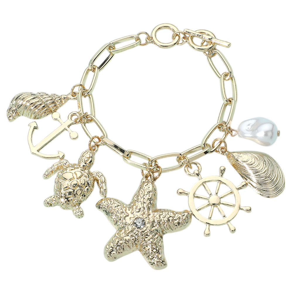 Textured Metal Starfish Shell Sea Turtle Anchor Pearl Charm Station Toggle Bracelet
