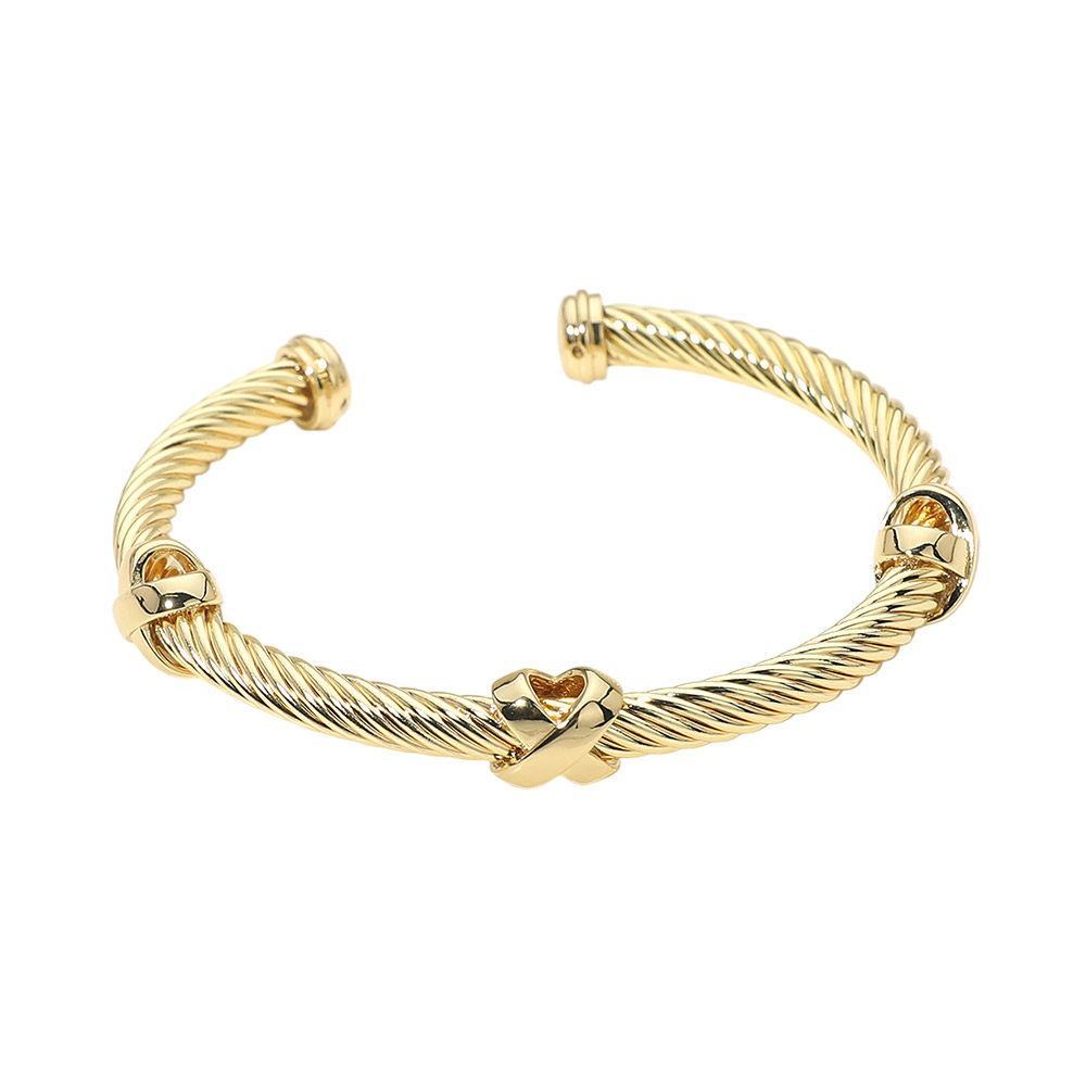 Details • Size : 0.3" H, 2.3" D • Cuff • Elegant open cuff bracelet featuring a twisted cable design with a sculpted heart accent at the center. Designed for easy wear and everyday styling, this timeless cuff adds a refined touch to casual and elevated looks, making it a versatile choice for boutiques, gifting, and layered jewelry collections. • Gold Dipped