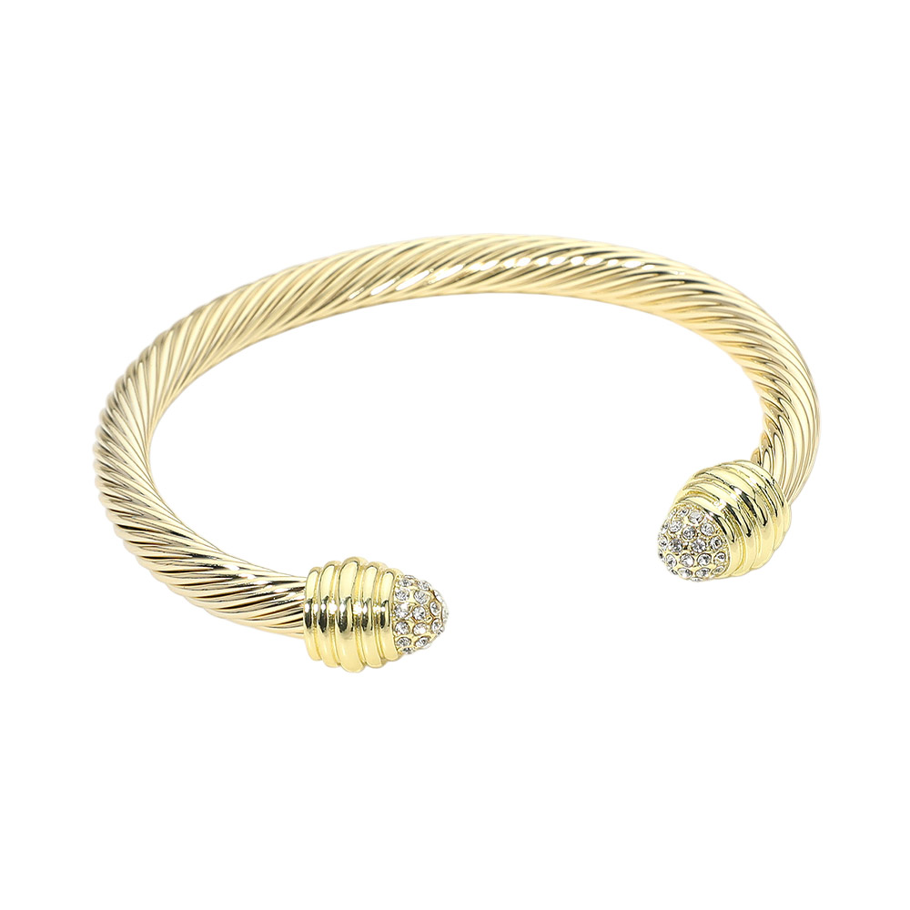 • Sleek open cuff bracelet featuring a twisted cable silhouette finished with sparkling crystal accent end caps. Designed for comfortable slip-on wear, this statement bracelet adds refined shine and modern elegance to everyday outfits, special occasions, and layered wrist styling. Perfect for gifting or boutique collections.