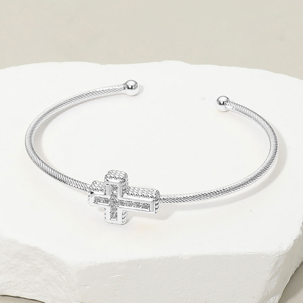 Details • Size : 0.5" H, 2.3" D • Cuff • Elevate your everyday style with this cross accent open cuff bracelet showcasing a sleek, minimalist silhouette with a refined symbolic centerpiece. Designed to complement layering or solo wear, it adds a polished finishing touch to casual outfits or elegant evening looks. • CZ Cubic Zirconia • Gold Dipped