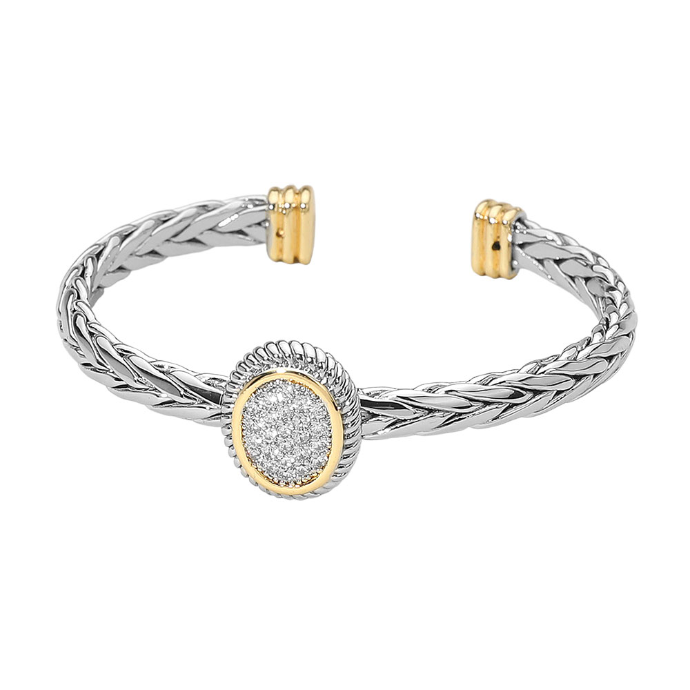 Details • Size : 0.75" H, 2.4" D • Cuff • Chic twisted cuff bracelet featuring a round center accent adorned with sparkling details. The open-end design allows for a comfortable fit, blending modern style with timeless sophistication. Perfect for layering or as a statement accessory for casual or formal looks. • CZ Cubic Zirconia