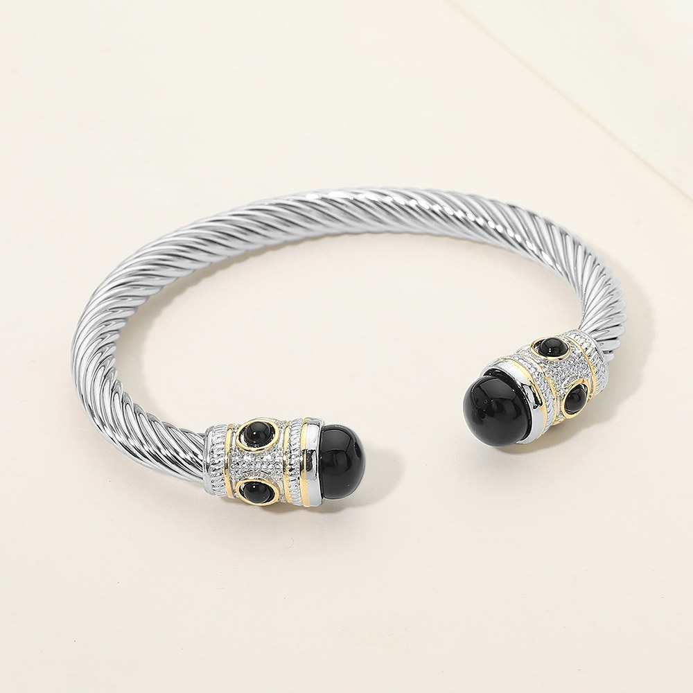 • Modern open cuff bracelet designed with a sleek twisted cable silhouette and refined stone-accented end caps. Easy to slip on and style, this bracelet adds a bold yet polished touch to everyday outfits, special occasions, or layered wrist looks, making it a versatile choice for gifting and fashion-forward collections.