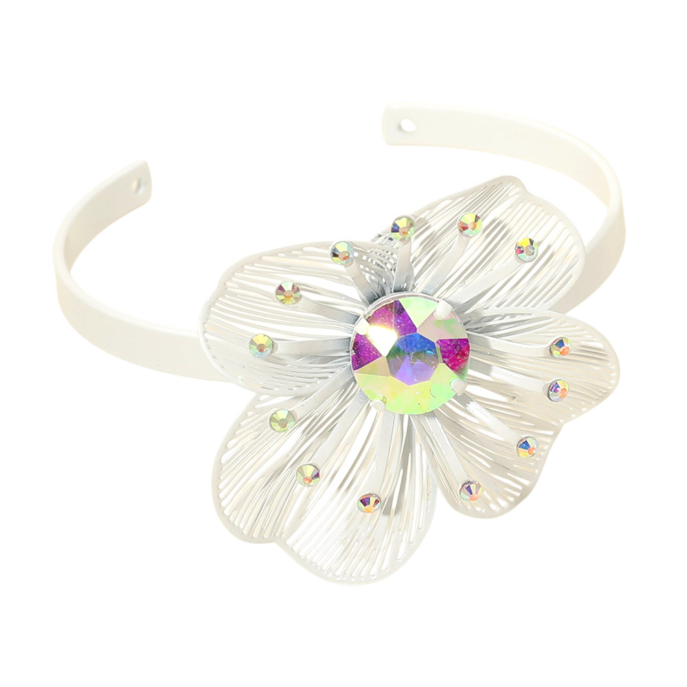 Details • Size : 1.5" H, 2.3" D • Cuff • Statement cuff bracelet featuring a bold floral design with a faceted center accent and delicate crystal details. Designed to stand out with sculptural petals and eye-catching shine, this cuff adds artistic flair and elegant impact to everyday outfits or special occasion styling. • Lead and Nickel Compliant