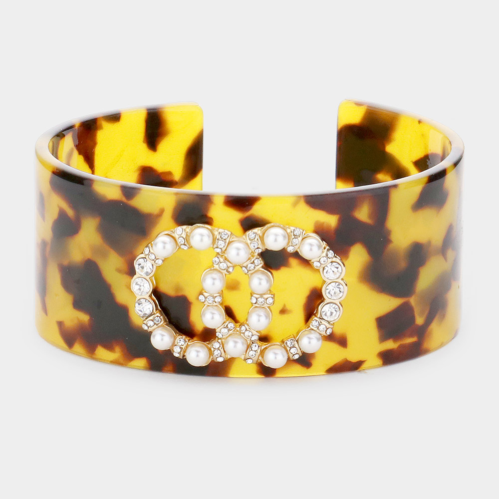 Pearl Rhinestone Embellished Celluloid Acetate Tortoise Cuff Bracelet
