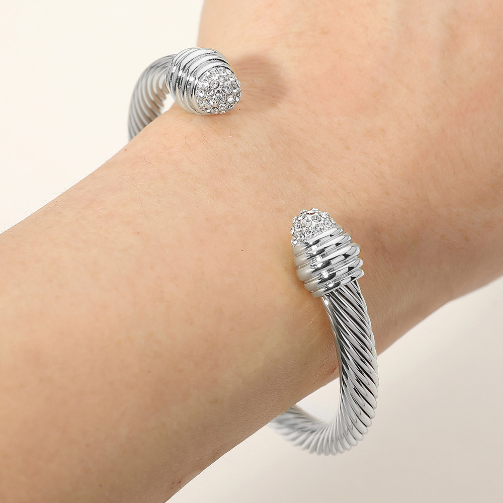 Details • Size : 0.3" H, 2.3" D • Cuff • Sleek open cuff bracelet featuring a twisted cable silhouette finished with sparkling crystal accent end caps. Designed for comfortable slip-on wear, this statement bracelet adds refined shine and modern elegance to everyday outfits, special occasions, and layered wrist styling. Perfect for gifting or boutique collections. • CZ Cubic Zirconia