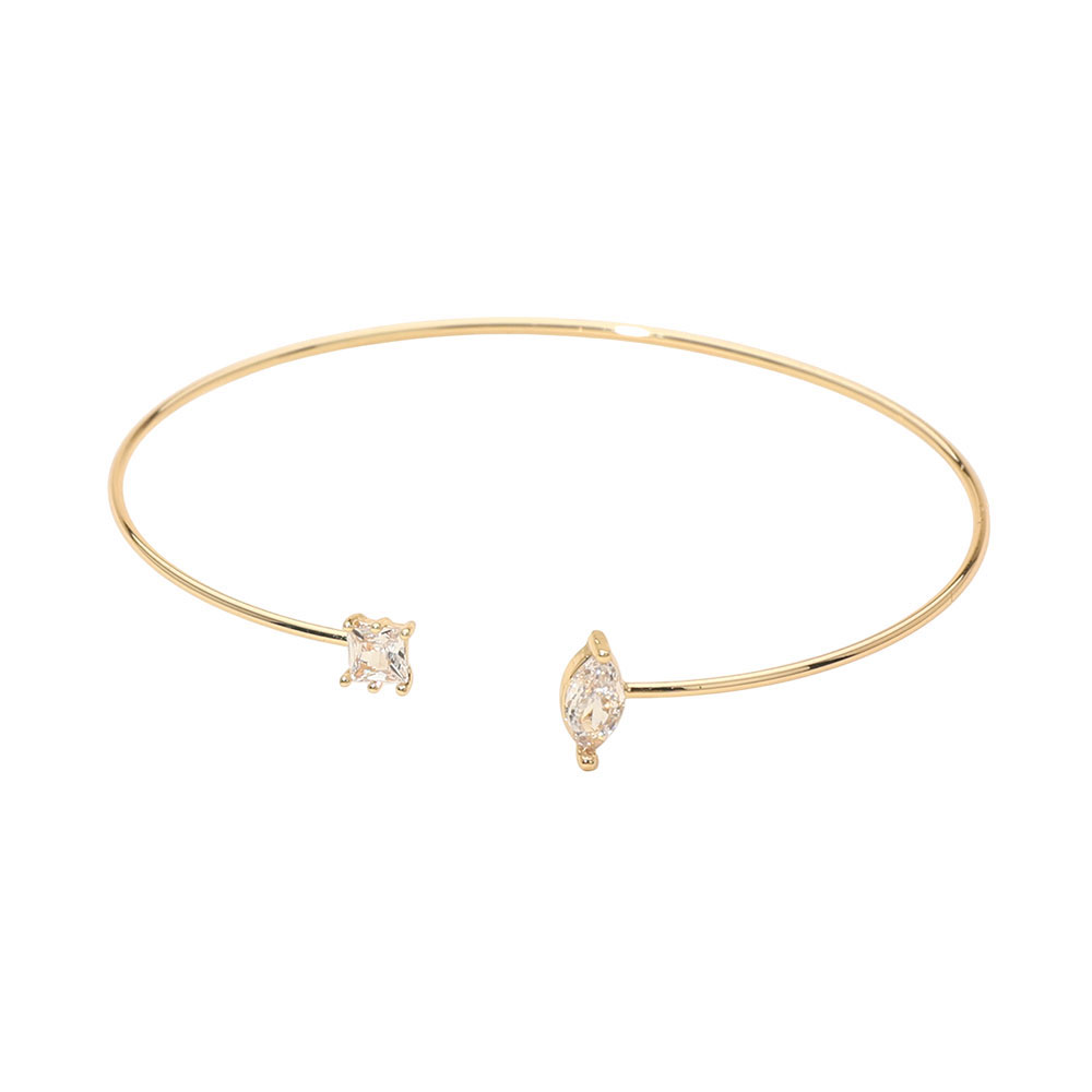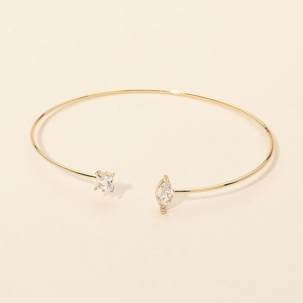 Details • Size : 0.4" H, 2.5" D • Cuff • Sleek open cuff bracelet featuring two distinct stone shapes at each end for a modern, asymmetrical look. Designed to add subtle sparkle and refined elegance, this versatile bracelet is perfect for everyday wear, stacking, gifting, and curated fashion jewelry assortments. • Brass