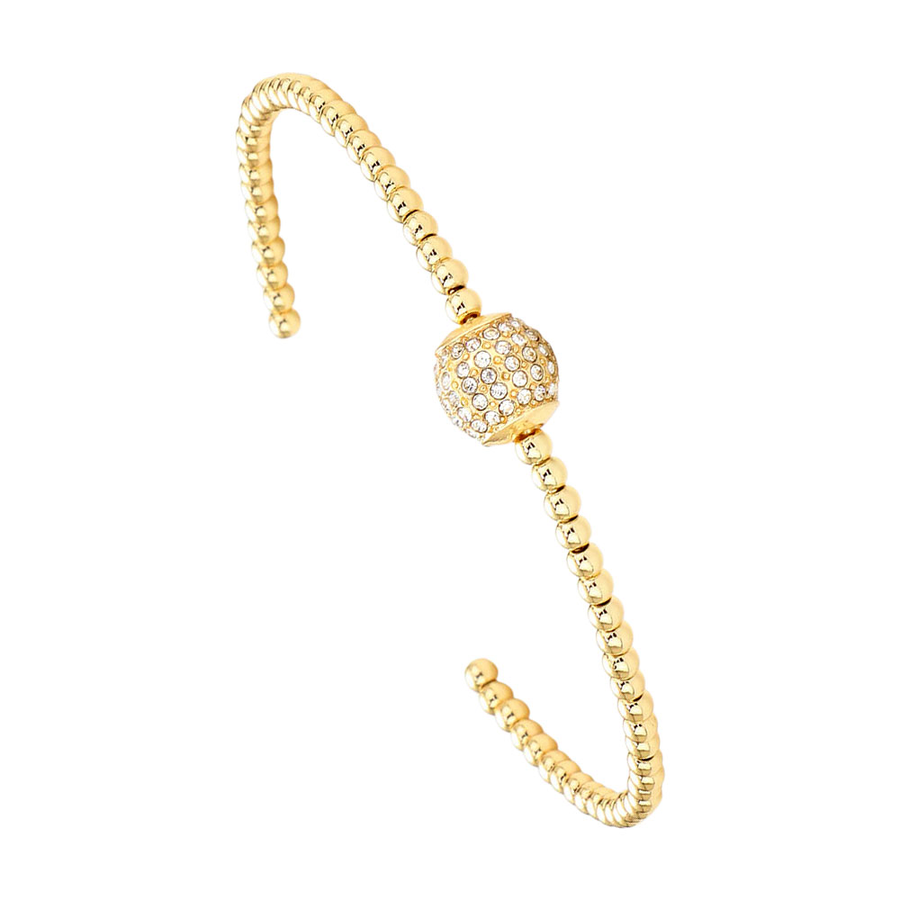 Details • Size : 0.35" H • Cuff • Elegant open cuff bracelet designed with polished beads and a sparkling pave-set center bead. Lightweight and stylish, this bracelet adds a refined shimmer, making it a versatile accessory for casual or formal looks. • Lead and Nickel Compliant