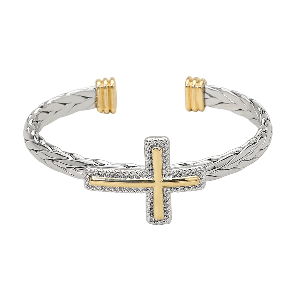 Details • Size : 0.8" H, 2.1" D • Cuff • Braided Cross Cuff Bracelet showcases a textured rope-style band with a bold cross centerpiece for a striking, symbolic accent. The open cuff design offers easy wear and a comfortable fit, making it ideal for everyday styling or meaningful gift giving.