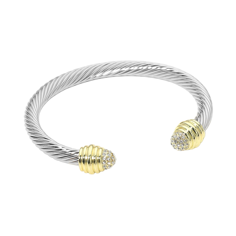 Details • Size : 0.3" H, 2.3" D • Cuff • Sleek open cuff bracelet featuring a twisted cable silhouette finished with sparkling crystal accent end caps. Designed for comfortable slip-on wear, this statement bracelet adds refined shine and modern elegance to everyday outfits, special occasions, and layered wrist styling. Perfect for gifting or boutique collections. • CZ Cubic Zirconia
