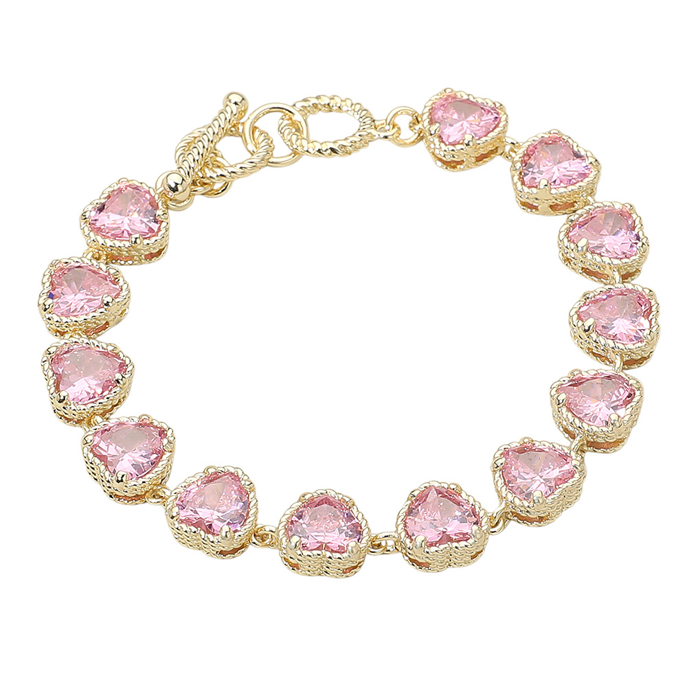 Details • Size : 0.3" H, 7" + 1" L • Toggle Closure • Showcase timeless romance with this bracelet featuring sparkling pink heart-cut crystals in a delicate linked setting. Its refined design captures light beautifully, making it the perfect accessory for adding elegance and charm to everyday wear or special celebrations. • Gold Dipped • CZ Cubic Zirconia