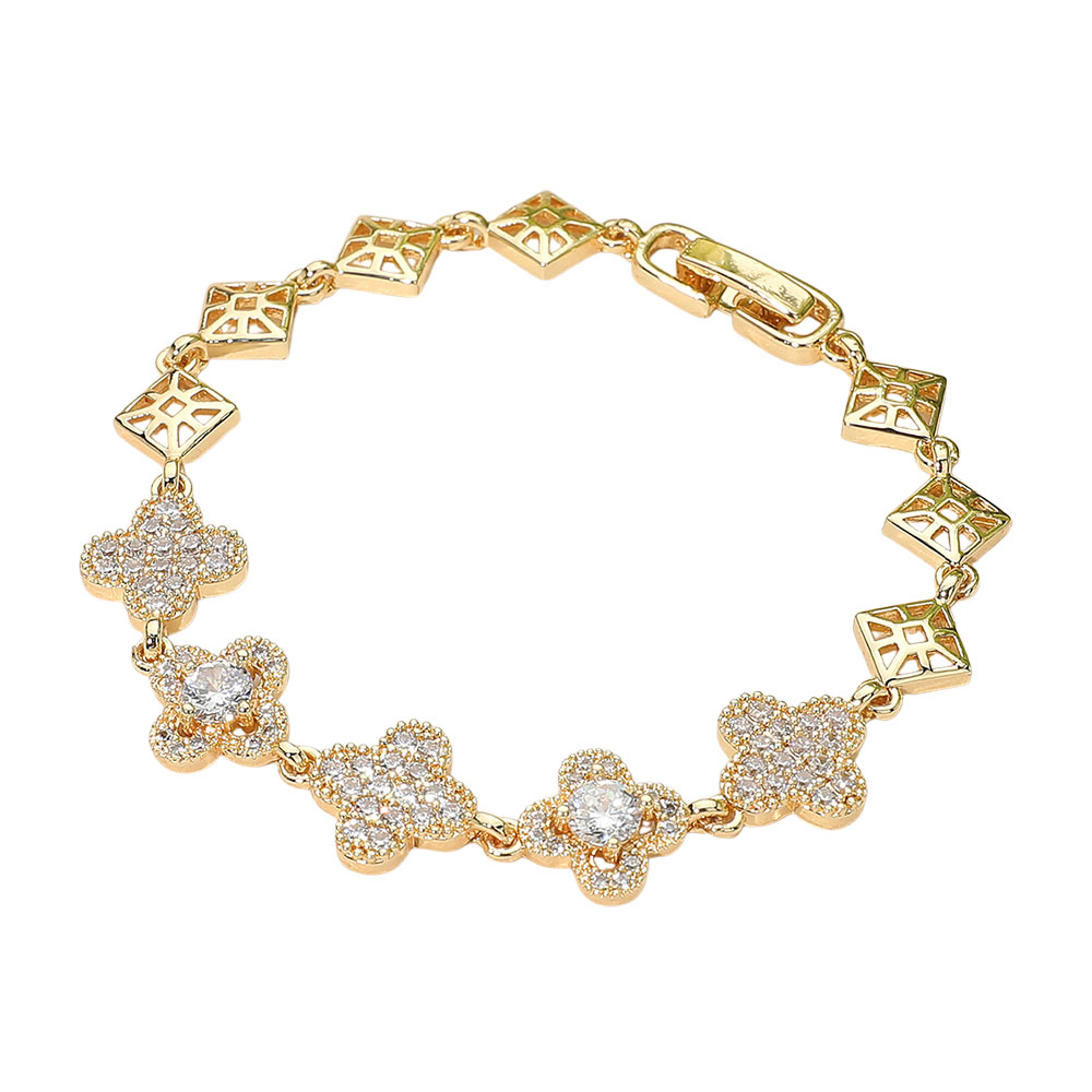 Details • Size : 0.5" H, 7.25" L • Fold Over Closure • This quatrefoil motif bracelet radiates elegance with its delicate flower-shaped links adorned with sparkling crystal accents. Perfectly balanced between classic charm and modern sophistication, it adds a refined touch to any outfit, making it a timeless piece for all occasions. • Brass • CZ Cubic Zirconia