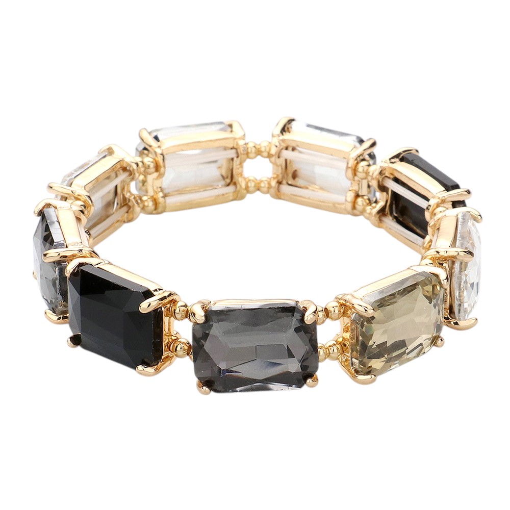 • Elegant emerald-cut crystal stretch bracelet with a faceted gemstone look and gold-tone setting. Perfect for adding a sophisticated sparkle to weddings, parties, or special events.