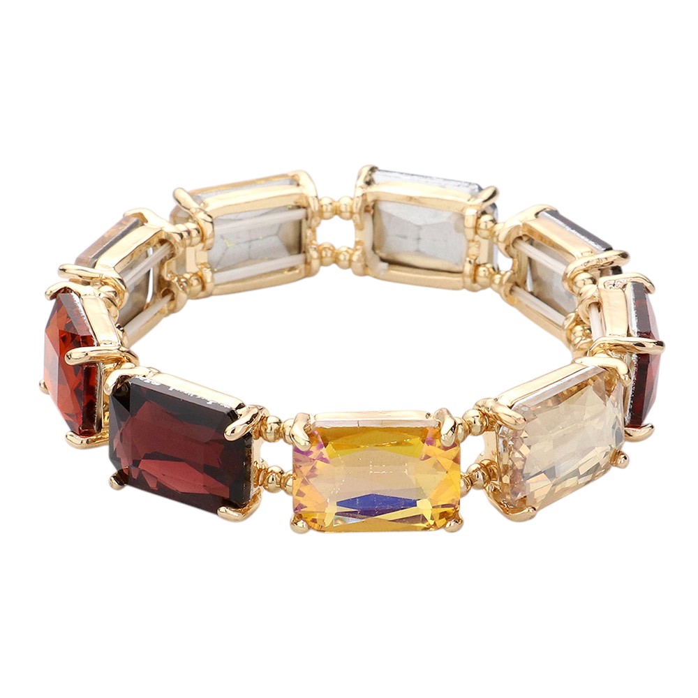 • Elegant emerald-cut crystal stretch bracelet with a faceted gemstone look and gold-tone setting. Perfect for adding a sophisticated sparkle to weddings, parties, or special events.