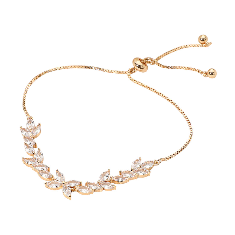 Details • Size : 0.3" H, 10.5" L • Adjustable • This adjustable bracelet features a graceful leaf motif adorned with shimmering crystals, creating a refined and radiant look. Designed for comfort and elegance, it’s an ideal choice for adding subtle sophistication to formal attire or elevating your everyday ensemble effortlessly. • CZ Cubic Zirconia • Lead and Nickel Compliant