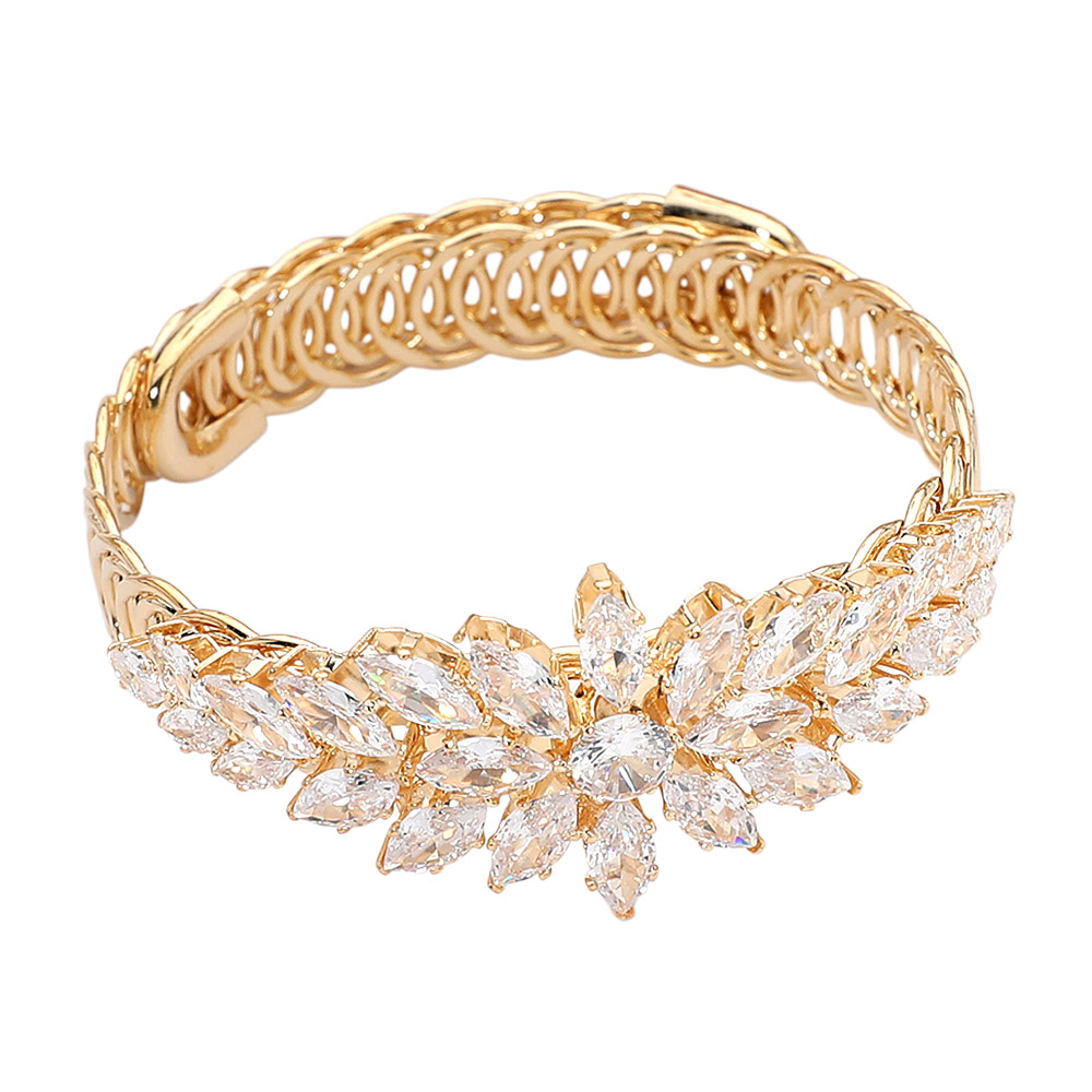 Details • Size : 0.9" H • Adjustable • Stunning bracelet featuring marquise-cut crystal clusters arranged in a refined floral design with an adjustable band for a comfortable fit. A beautiful accessory for weddings, formal events, and special occasions, adding timeless sparkle to any style. • CZ Cubic Zirconia • Lead and Nickel Compliant