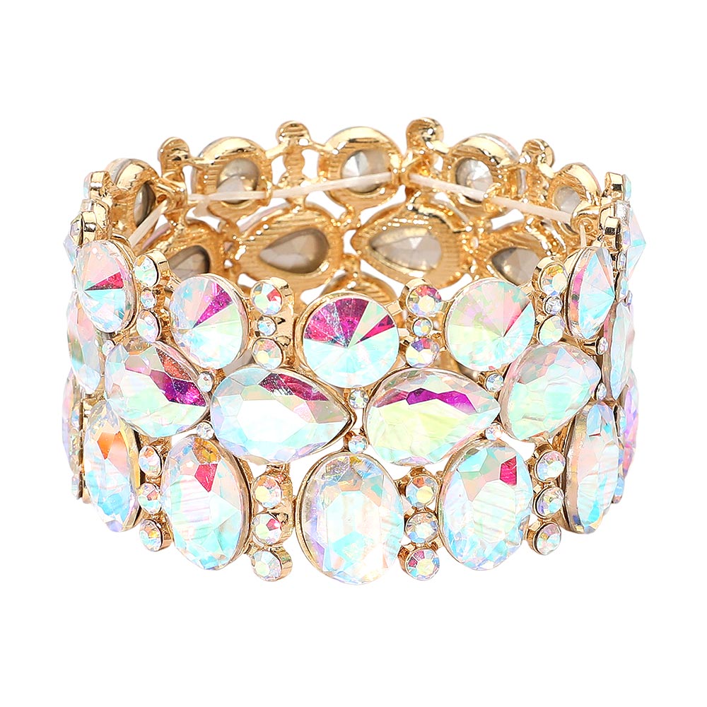 Details • Size : 1.6" H, 2.5" D • Stretchable • This elegant gemstone statement bracelet dazzles with a stunning mix of oval and round-cut stones arranged in an intricate pattern. Designed to catch the light from every angle, it adds sophistication and glamour to any ensemble—perfect for special occasions or evening wear. • Lead and Nickel Compliant