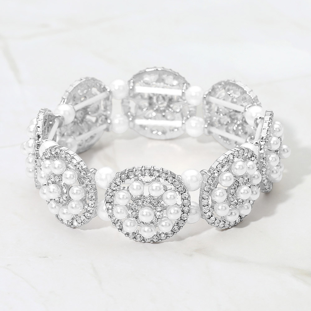 • This round pearl accent stretch bracelet features linked circular stations with layered bead detailing and a flexible slip-on fit. Designed for effortless styling, it pairs easily with everyday outfits, dress looks, special occasions, gifting, boutiques, and elegant accessory collections.