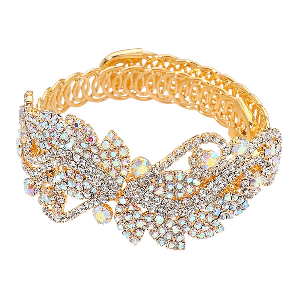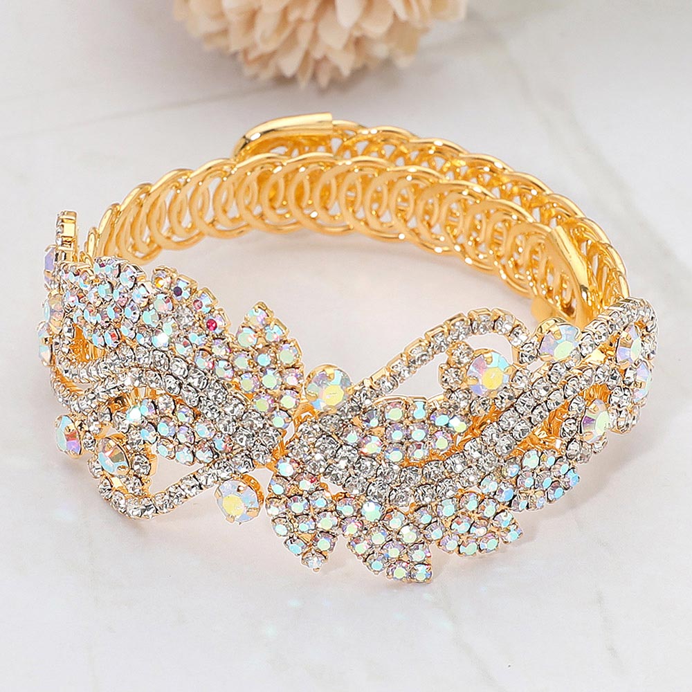 • Sparkling leaf-vine rhinestone bracelet featuring intricate crystal clusters, elegant scrolling accents, and a comfortable adjustable fit. A stunning accessory for formal events, weddings, and special occasions, adding refined shine to any look.