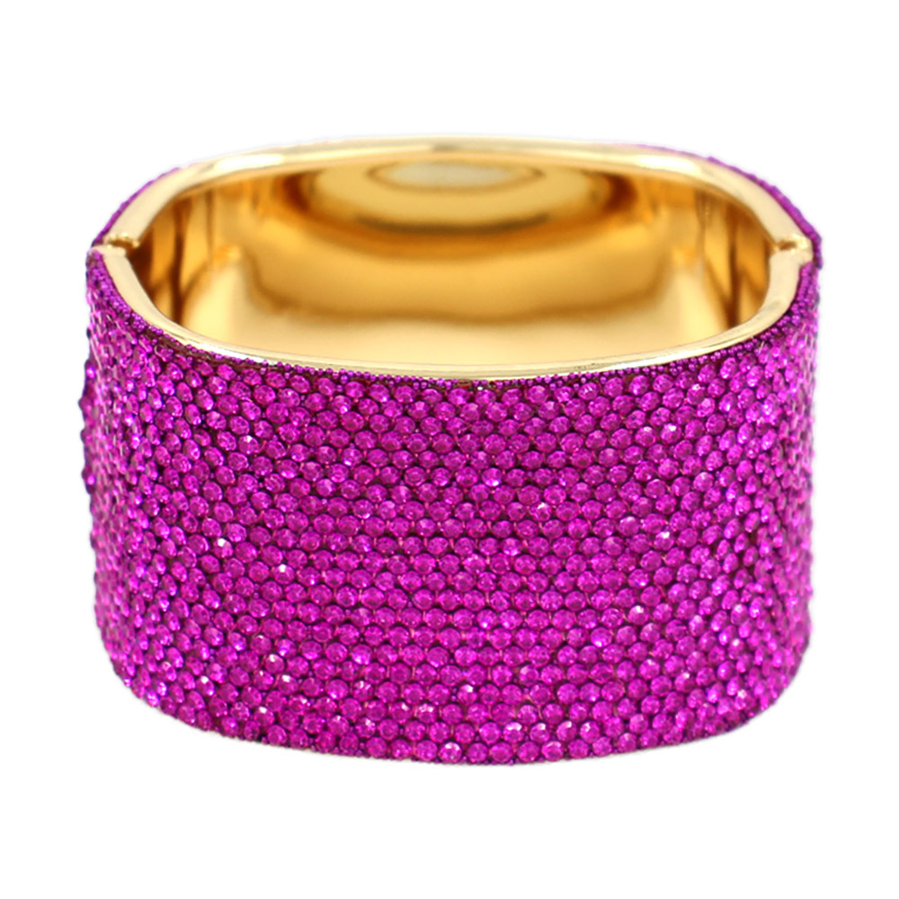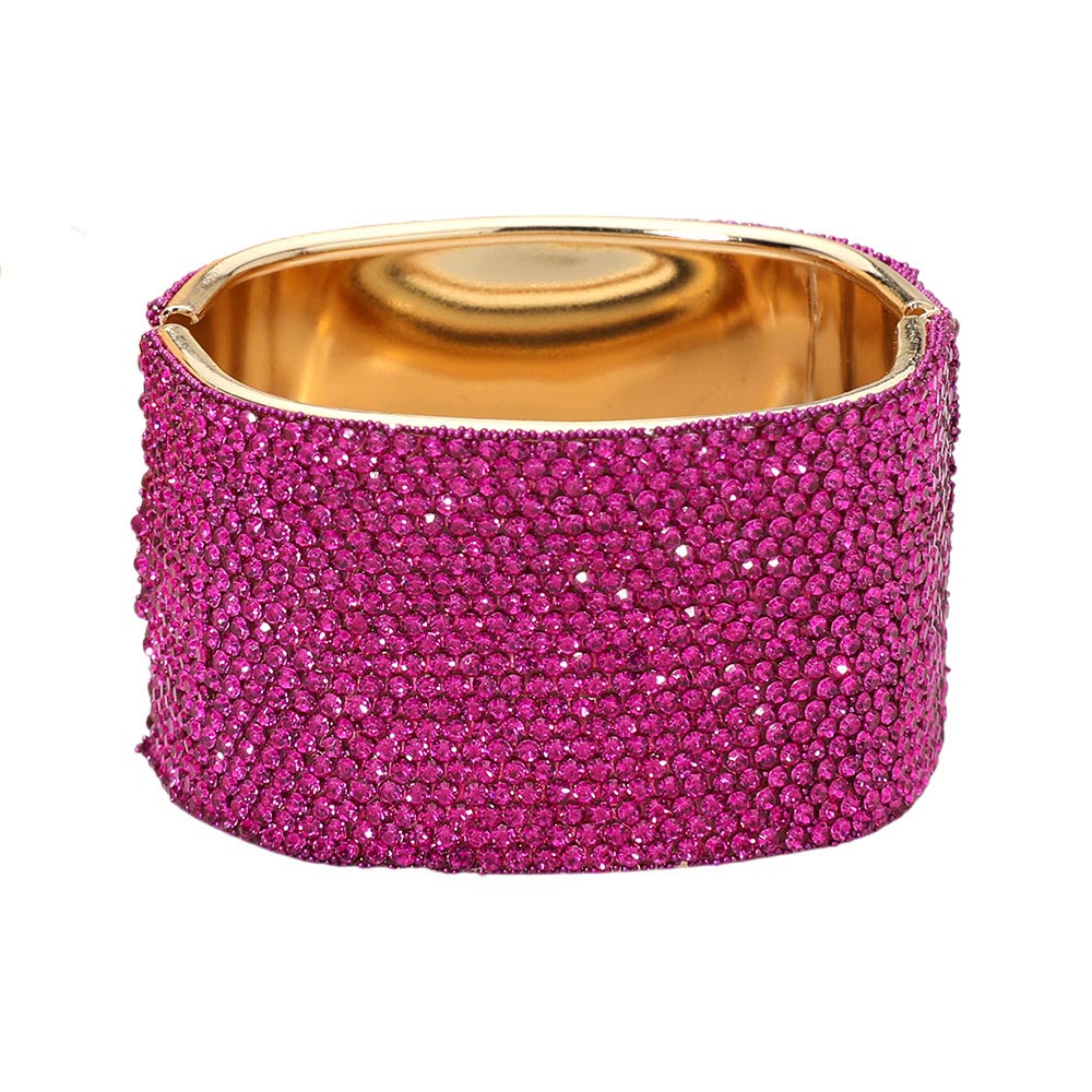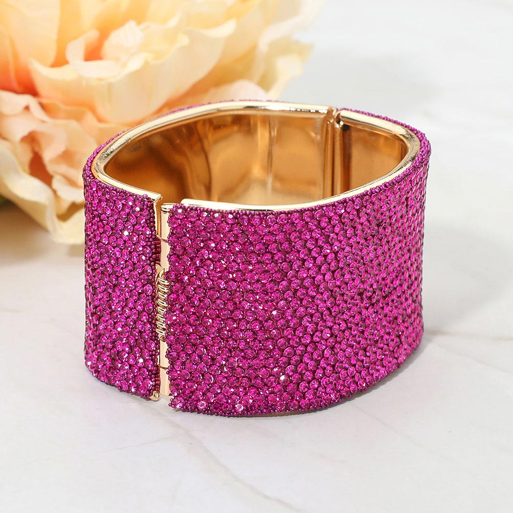 • Statement bangle bracelet featuring a bold, wide silhouette with a smooth interior and secure hinge closure. Designed to elevate evening looks, bridal styling, and special occasions, this bracelet delivers high-impact shine and a polished finish for confident, standout accessorizing.