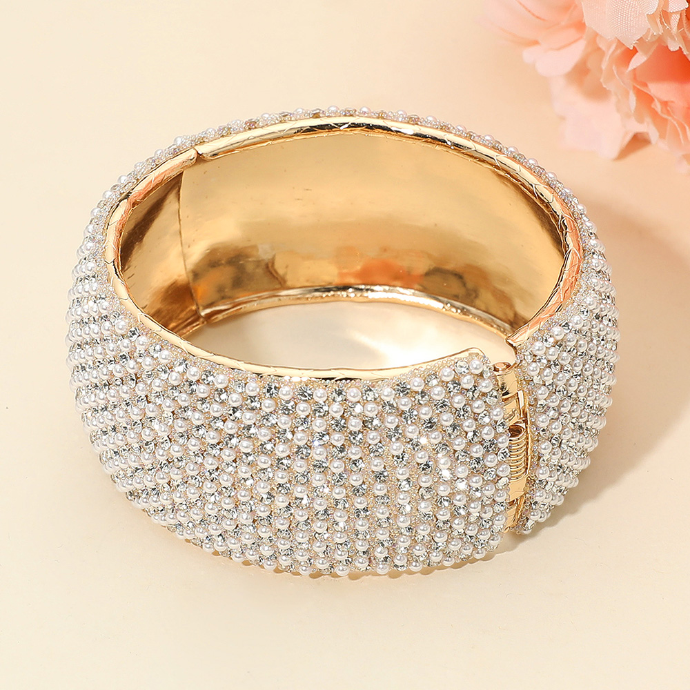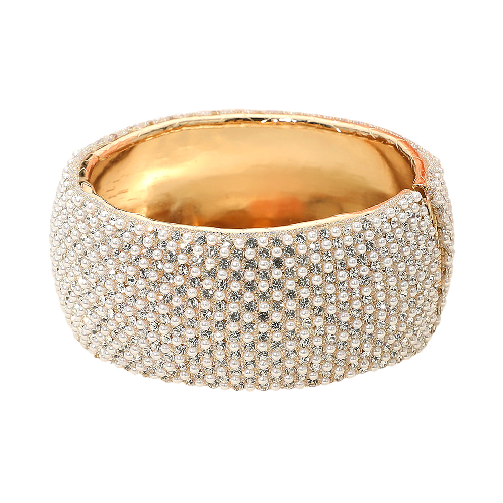 Details • Size : 1.25" H, 2.5" D • Hinged Closure • Elevate your look with this wide crystal and pearl pave bracelet featuring a bold, shimmering design. Perfect as a statement bangle for parties, weddings, and special events, this sparkling accessory adds glamour and sophistication to any outfit. • Lead and Nickel Compliant
