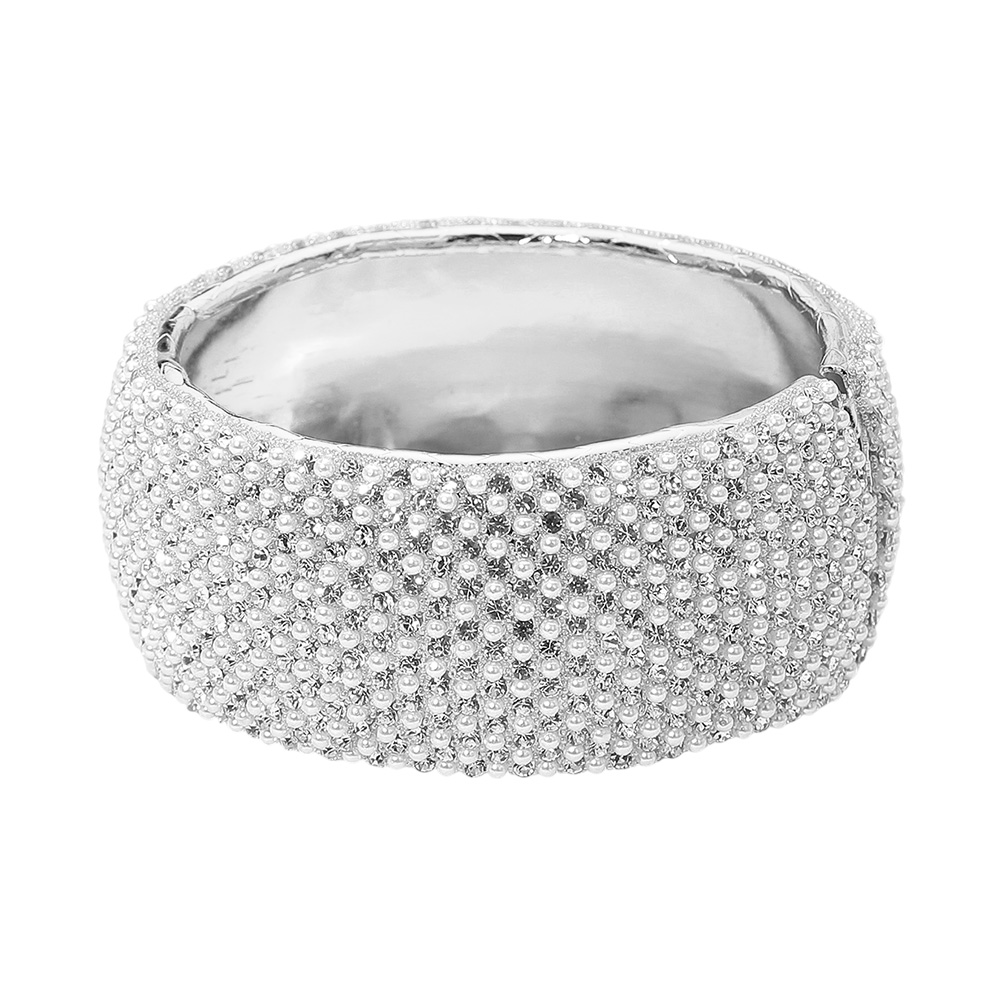 Details • Size : 1.25" H, 2.5" D • Hinged Closure • Elevate your look with this wide crystal and pearl pave bracelet featuring a bold, shimmering design. Perfect as a statement bangle for parties, weddings, and special events, this sparkling accessory adds glamour and sophistication to any outfit. • Lead and Nickel Compliant