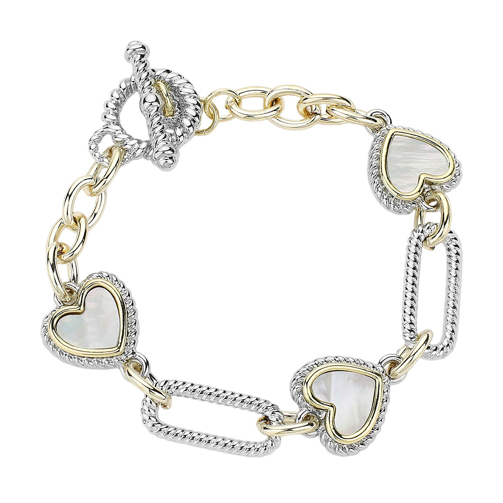 Mother Of Pearl Heart Charm Pointed 14K Gold Plated Two Tone Metal Link Toggle Bracelet