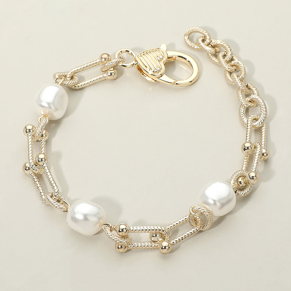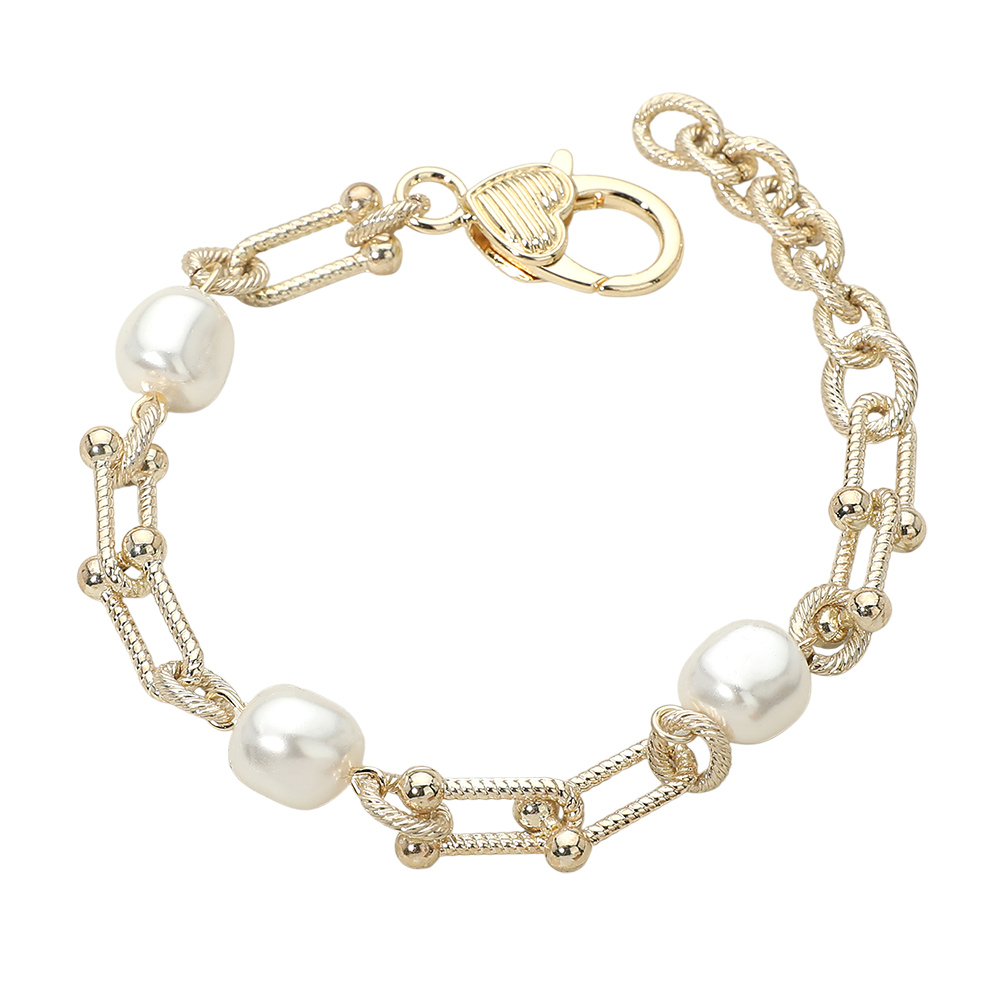 Details • Size : 0.3" H, 7.5" + 1.5" L • Lobster Clasp Closure • Stylish link chain bracelet featuring smooth pearl accents for a refined, modern look. Designed to balance classic elegance with contemporary appeal, this versatile piece is ideal for everyday wear or curated collections, offering effortless styling and timeless charm. • Gold Dipped
