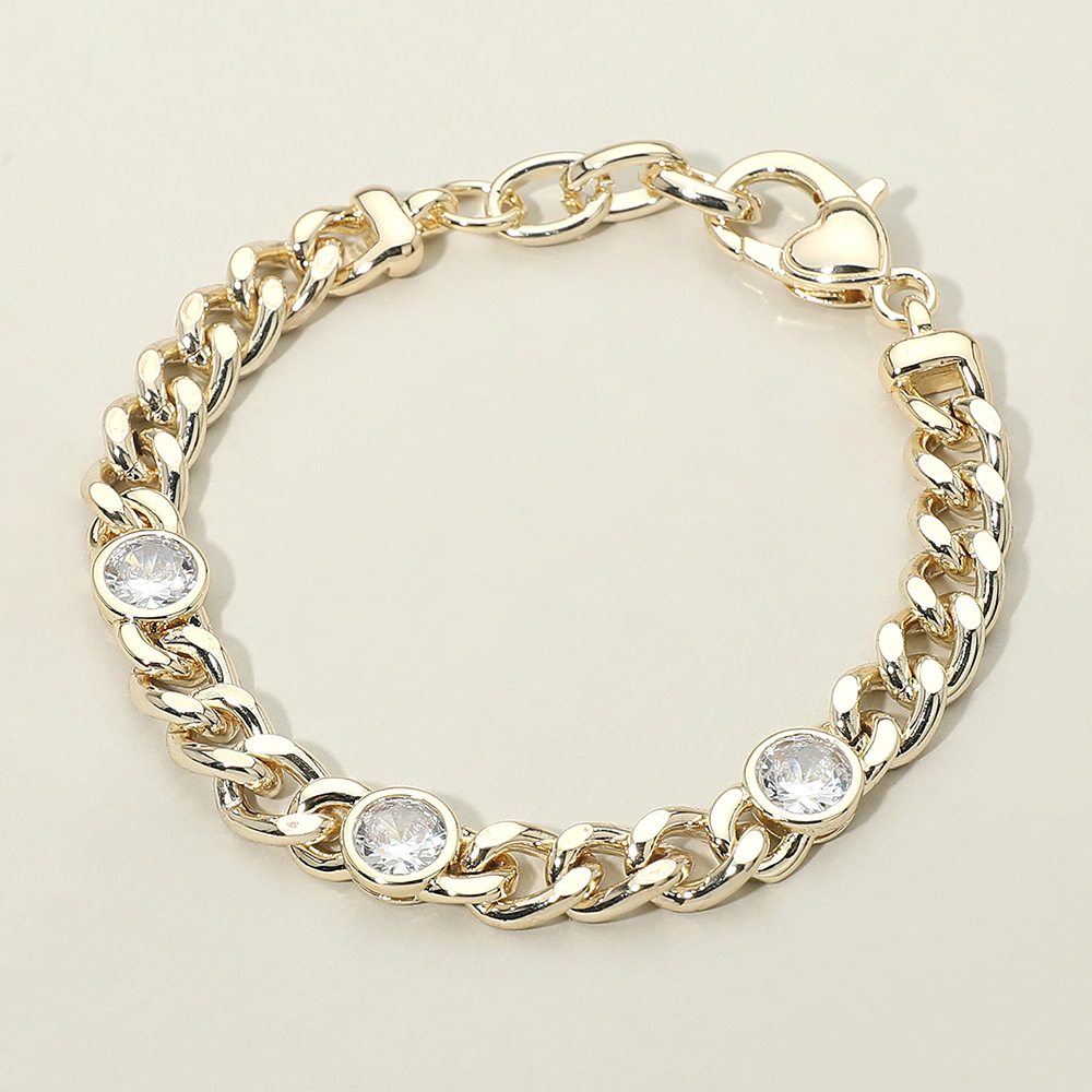 Details • Size : 0.3" H, 7.25" + 1.25" L • Lobster Clasp Closure • Stylish link chain bracelet highlighted with round CZ accents for a polished, modern look. Designed to balance bold structure with subtle sparkle, this bracelet is perfect for everyday wear or special occasions. Ideal for stacking or wearing solo as a refined statement piece. • Gold Dipped • CZ Cubic Zirconia