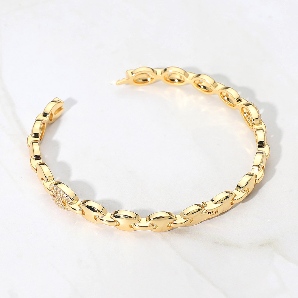 Details • Size : 0.3" H, 2.25" D • Hinged Closure • Add a refined touch to your look with this chain link bangle bracelet featuring a sparkling crystal accent. Sleek and stylish, it combines modern design with timeless elegance, making it the perfect accessory for daily wear or special occasions. • Gold Dipped