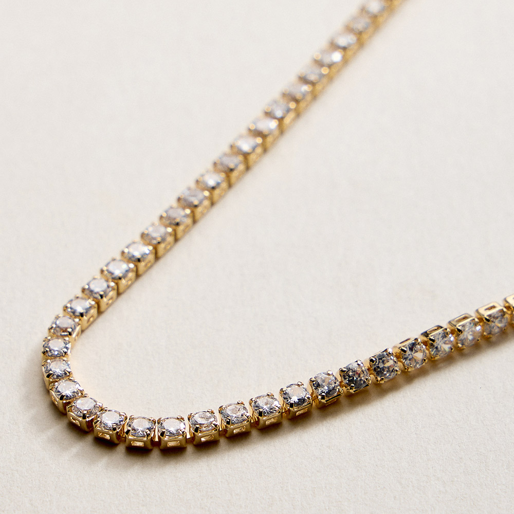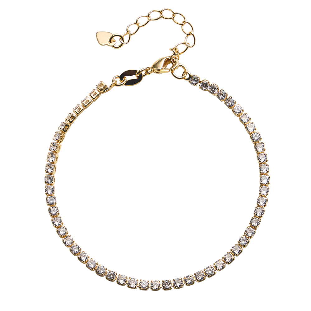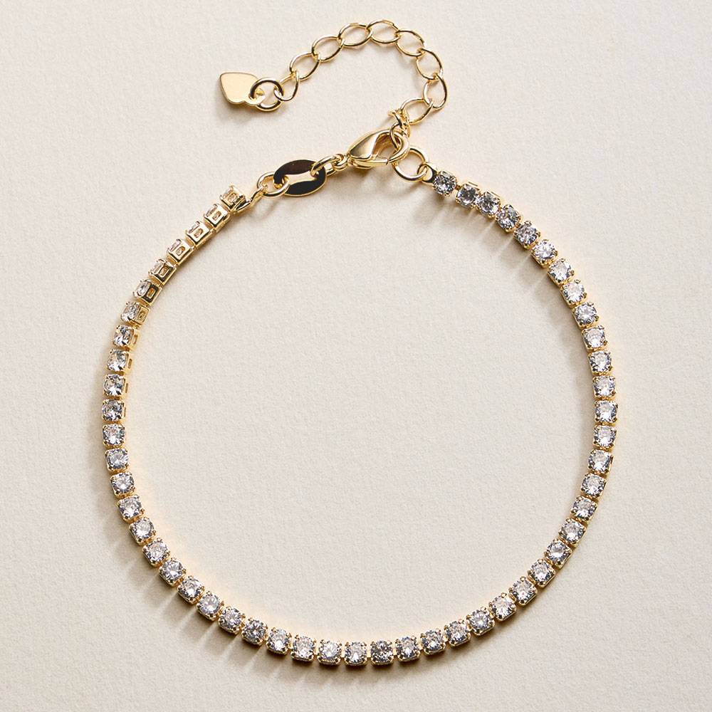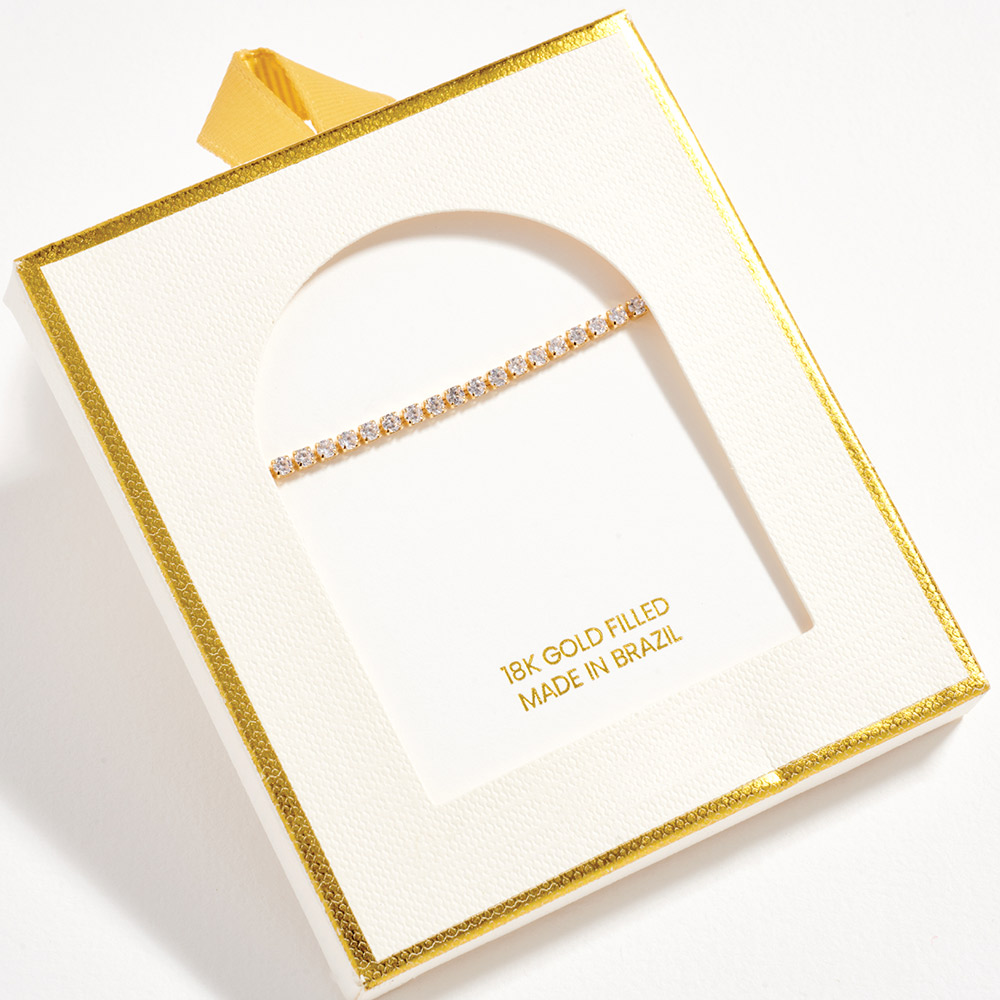 Details • Size : 0.1" H, 7" + 1.75" L • Lobster Clasp Closure • This classic tennis chain bracelet delivers timeless elegance with a clean, refined silhouette. Designed with an adjustable extension for a comfortable fit, it’s ideal for stacking or wearing solo. A versatile jewelry essential perfect for everyday styling, special occasions, gifting, and curated retail collections. • CZ Cubic Zirconia • Gold Filled • Hypoallergenic • Lead and Nickel Compliant • Made In Brazil