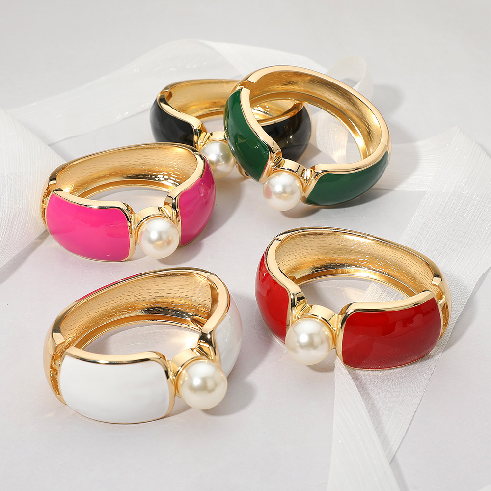 Details • Size : 1.2" H, 2.5" D • Hinged Closure • Chic wide cuff bracelet featuring a smooth enamel finish and bold central pearl accent for a sophisticated look. Perfect for adding elegance to any outfit, this statement piece offers a modern twist with a secure hinged closure and polished finish ideal for day or evening wear. • Lead and Nickel Compliant