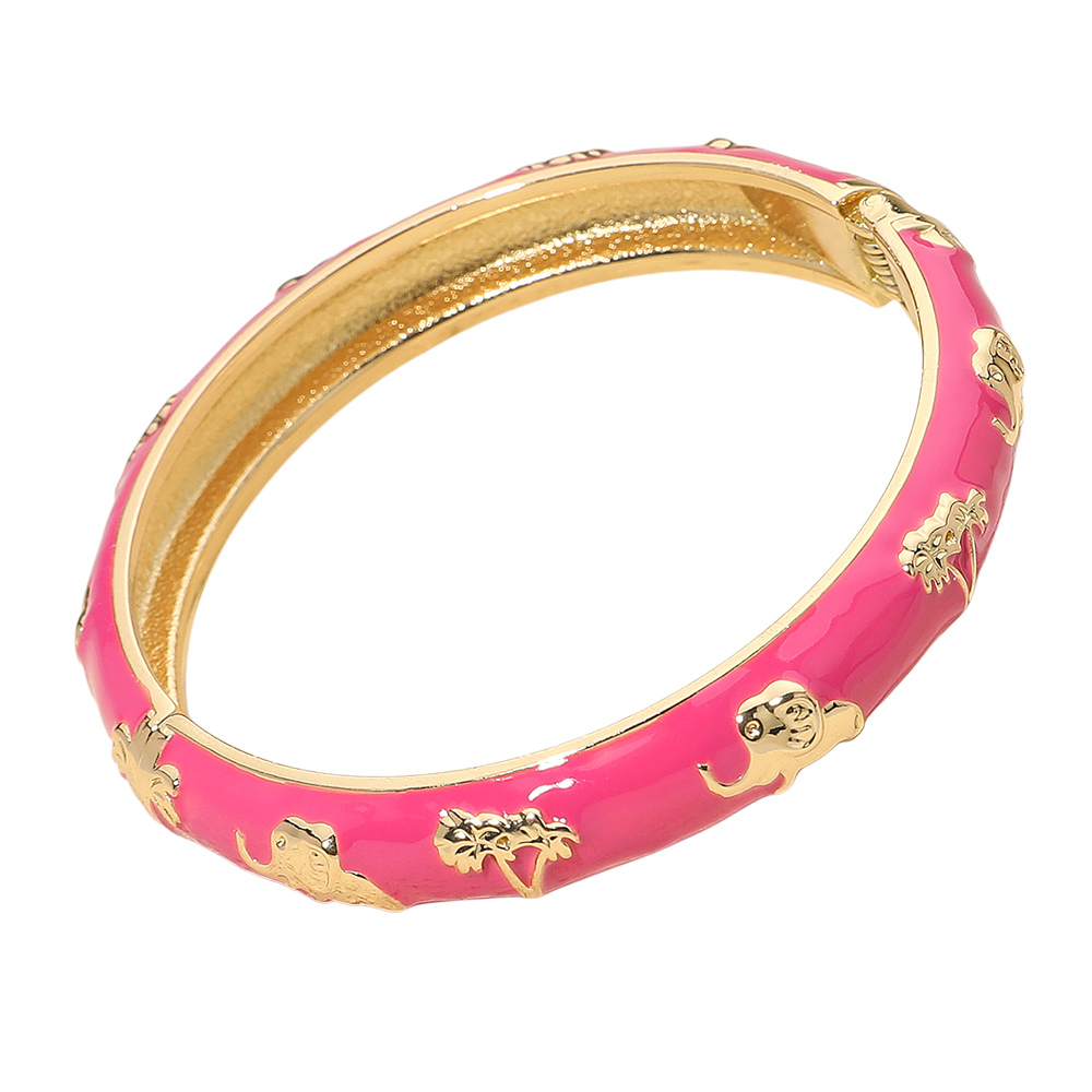 • Elegant hinged bangle bracelet featuring embossed elephant and tree motifs for a touch of exotic charm. The smooth enamel finish and polished edges create a refined look, making it a perfect accessory to complement everyday outfits or add flair to special occasion styles.