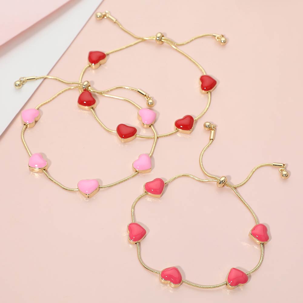 Details • Size : 0.3" H • Adjustable • Elegant adjustable bracelet featuring glossy heart station accents evenly spaced along a smooth slider chain. Designed for a comfortable, flexible fit, this romantic style is perfect for everyday wear, gifting, or layering with other bracelets. A charming addition to boutique assortments and curated jewelry collections. • Lead and Nickel Compliant