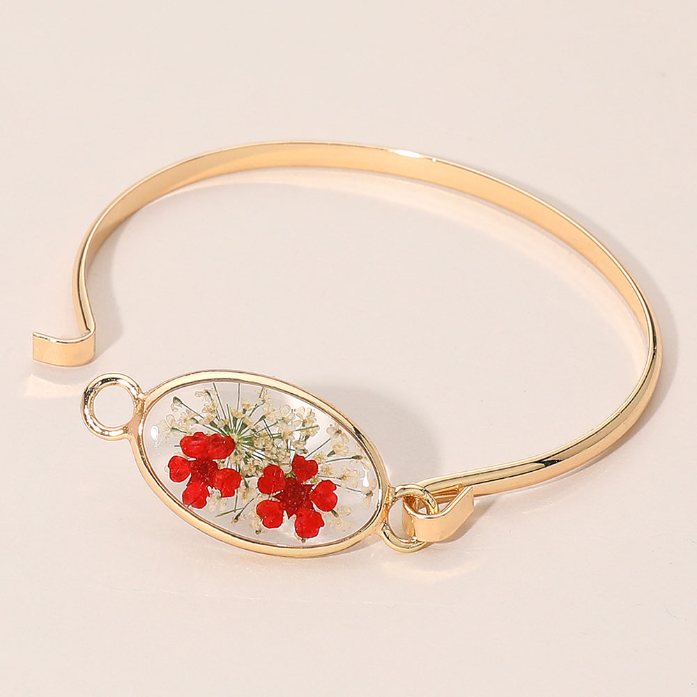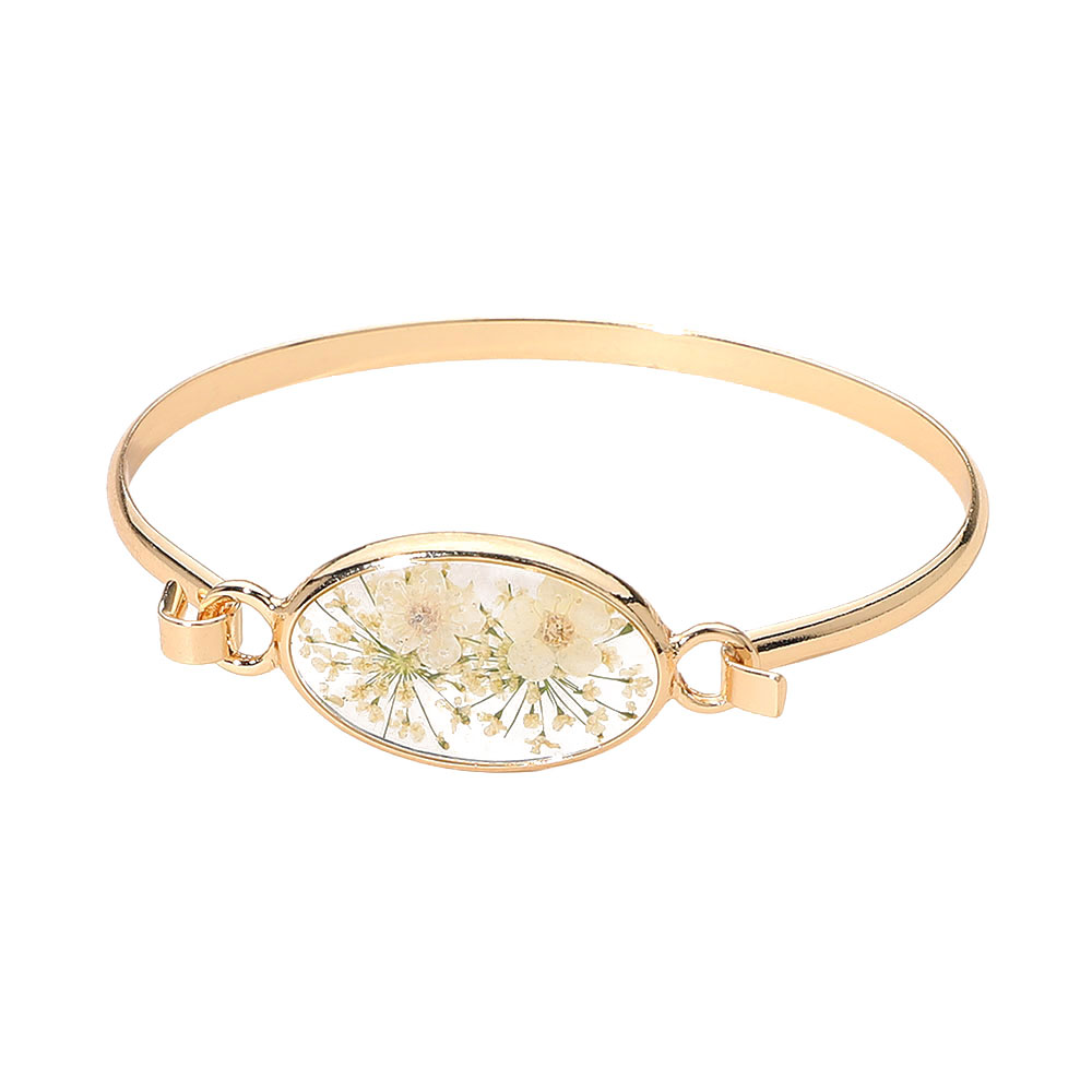 Details • Size : 0.7" H, 2.4" D • Hook Closure • Elevate everyday style with this Floral Encased Oval Bangle Bracelet, featuring a delicate preserved-flower centerpiece inside a sleek oval frame. Designed for comfortable wear and easy layering, it adds a refined, nature-inspired accent to casual looks, work outfits, or special occasions and makes a thoughtful gift choice. • Lead and Nickel Compliant