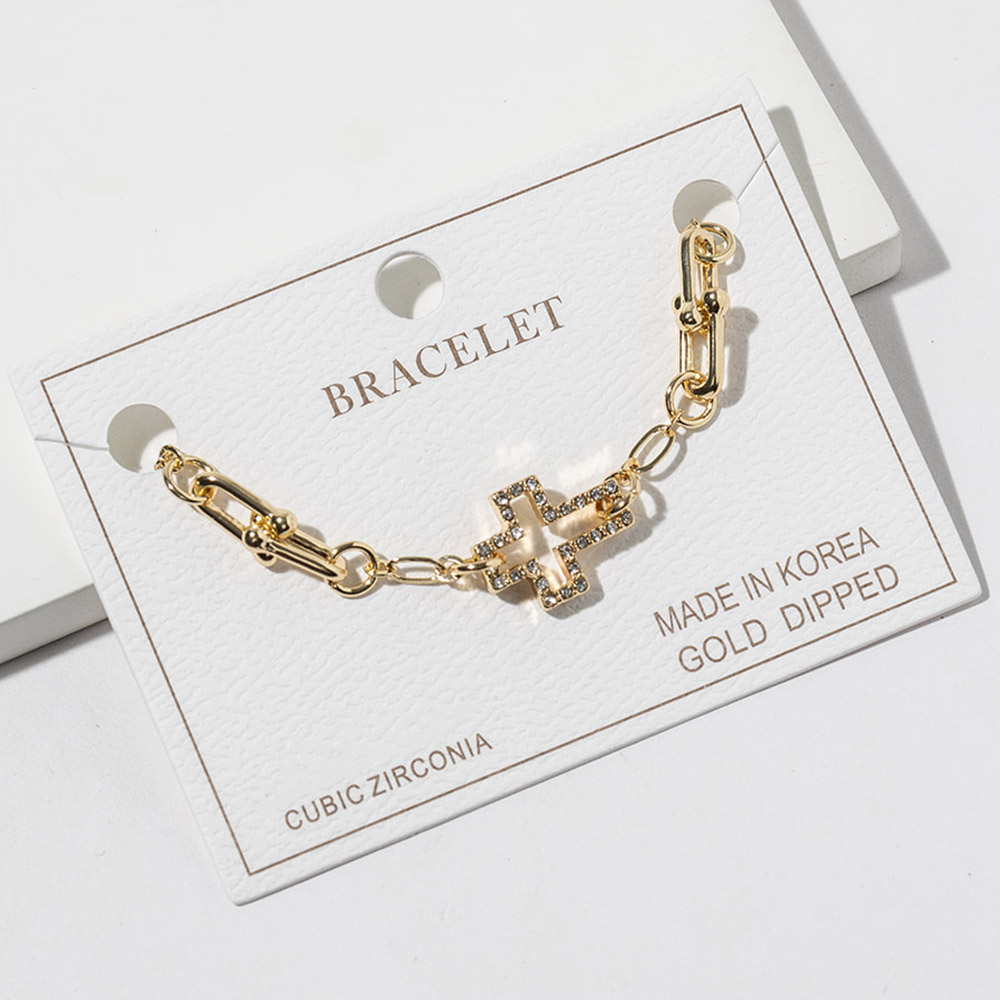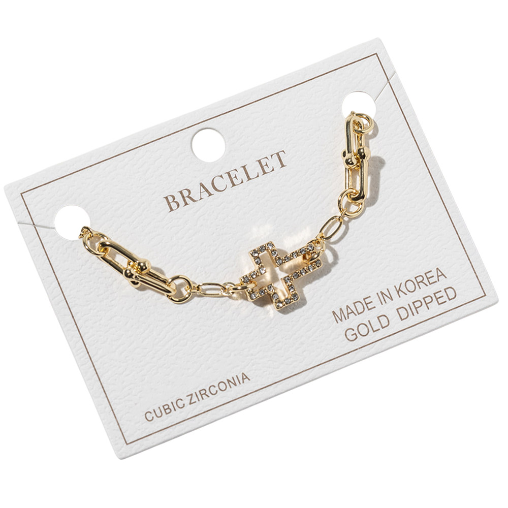 Details • Size : 0.5" H, 5" + 2.5" L • Lobster Clasp Closure • Elegant link bracelet featuring a refined cross charm accented with cubic zirconia for subtle sparkle. Designed to elevate everyday outfits or complement special occasion looks, this bracelet is ideal for layering, gifting, and curated boutique jewelry collections. • CZ Cubic Zirconia • Gold Dipped • Lead and Nickel Compliant • Made In Korea