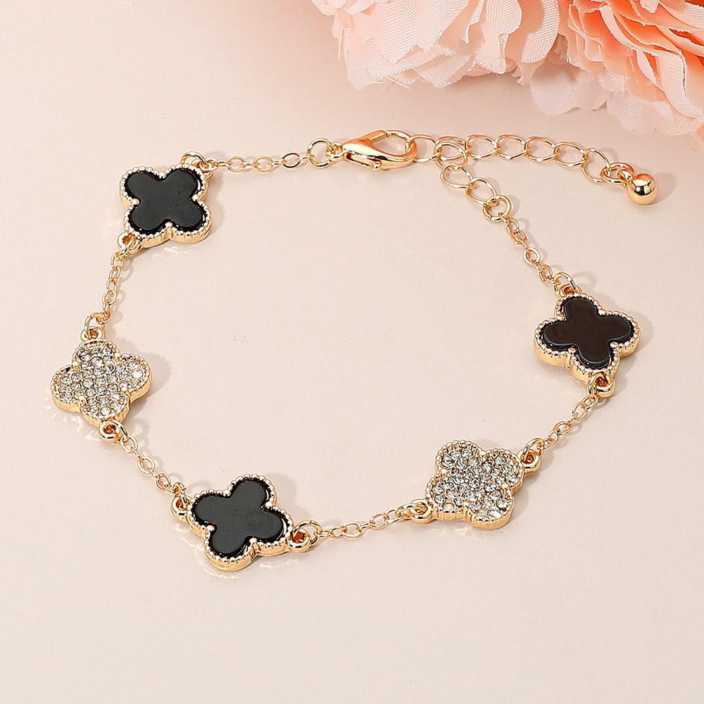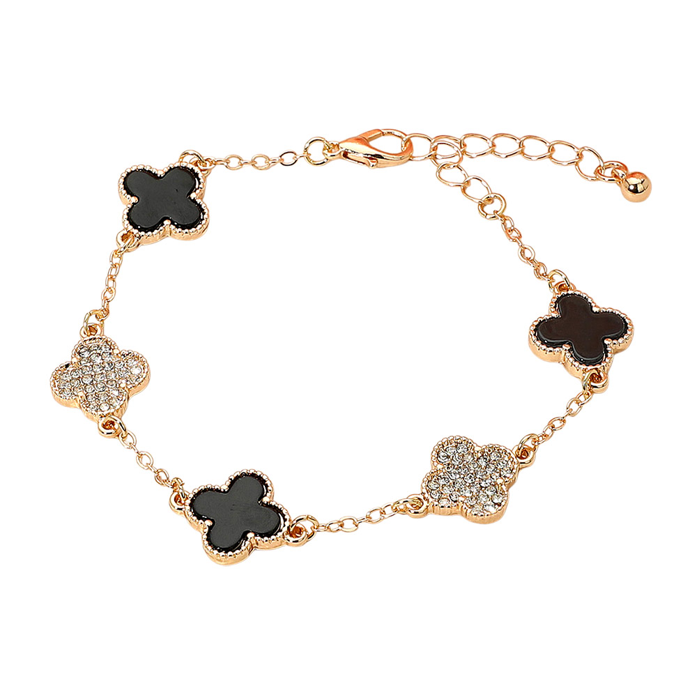 Details • Size : 0.5" H, 7.5" + 1.5" L • Lobster Clasp Closure • Elevate your style with this elegant quatrefoil charm bracelet featuring sparkling crystal accents. A chic quatrefoil design perfect for layering or gifting. Adjustable chain for a comfortable fit and everyday glam. • Lead and Nickel Compliant • Gold Dipped