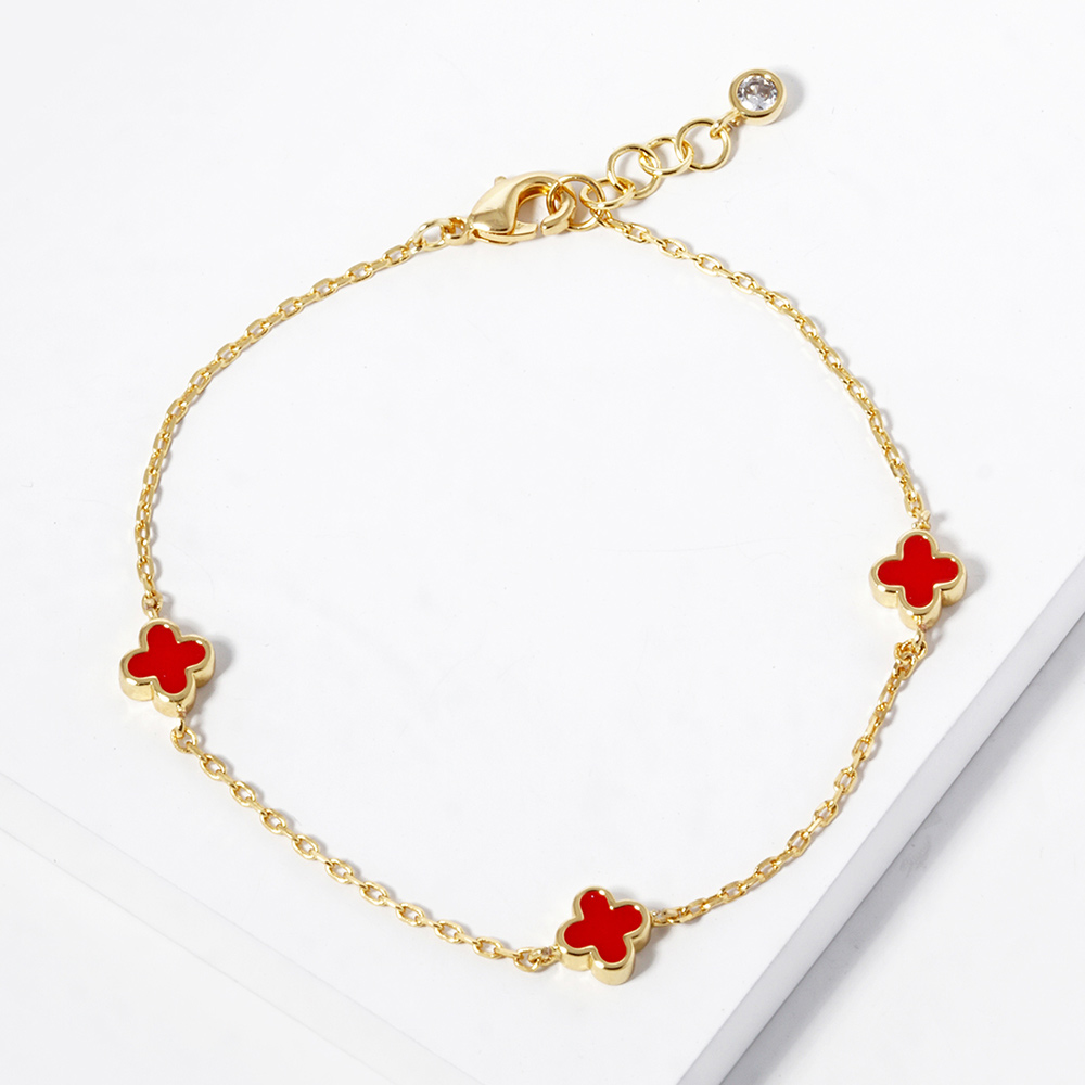 • Delicate chain bracelet featuring mini three quatrefoil charms linked evenly along the chain. Elegant and lightweight, this bracelet adds a refined and timeless touch to any look, perfect for everyday wear or special occasions. A simple yet sophisticated accessory for modern style.