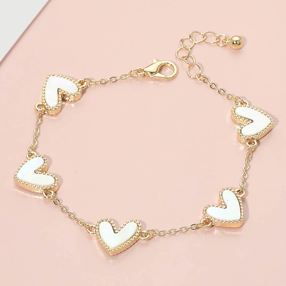 Details • Size : 0.4" H, 7" + 1.25" L • Lobster Clasp Closure • Delicate heart-shaped charms are evenly linked along a fine chain to create a romantic and timeless bracelet design. Finished with a secure clasp and extender for adjustable comfort, this piece is ideal for everyday styling, gifting occasions, or layering in curated jewelry collections. Perfect for boutique and wholesale assortments. • Lead and Nickel Compliant