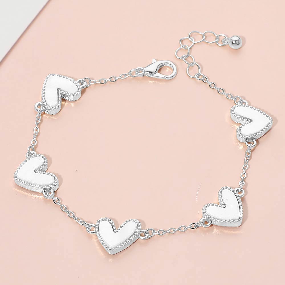 Details • Size : 0.4" H, 7" + 1.25" L • Lobster Clasp Closure • Delicate heart-shaped charms are evenly linked along a fine chain to create a romantic and timeless bracelet design. Finished with a secure clasp and extender for adjustable comfort, this piece is ideal for everyday styling, gifting occasions, or layering in curated jewelry collections. Perfect for boutique and wholesale assortments. • Lead and Nickel Compliant