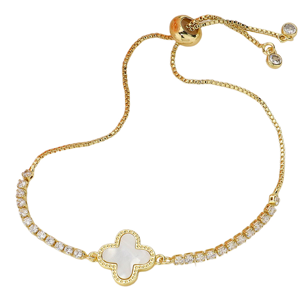 Mother Of Pearl Quatrefoil Pointed Brass Metal Round CZ Stone Adjustable Pull Tie Bracelet