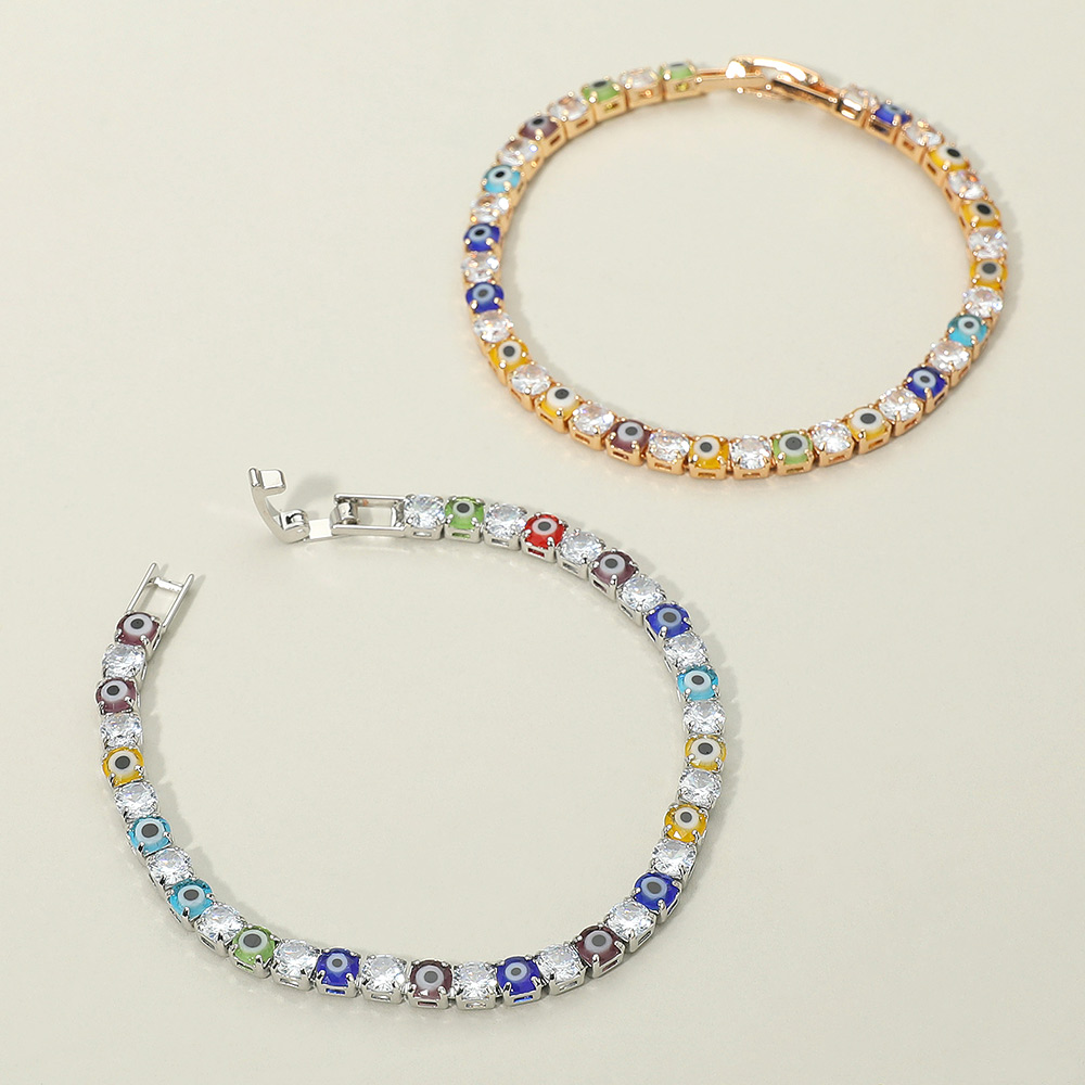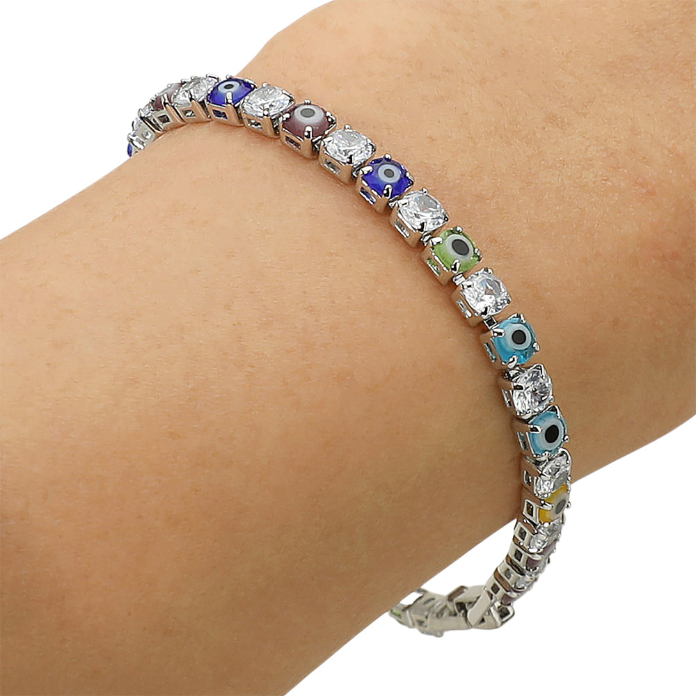 Details • Size : 0.1" H, 6.5" L • Fold Over Closure • Brighten your style with this gold bracelet adorned with multicolor evil eye charms and sparkling crystal accents. Designed to bring both fashion and protection, it’s perfect for stacking, gifting, or wearing daily. A unique piece that combines vibrant details with timeless elegance. • CZ Cubic Zirconia