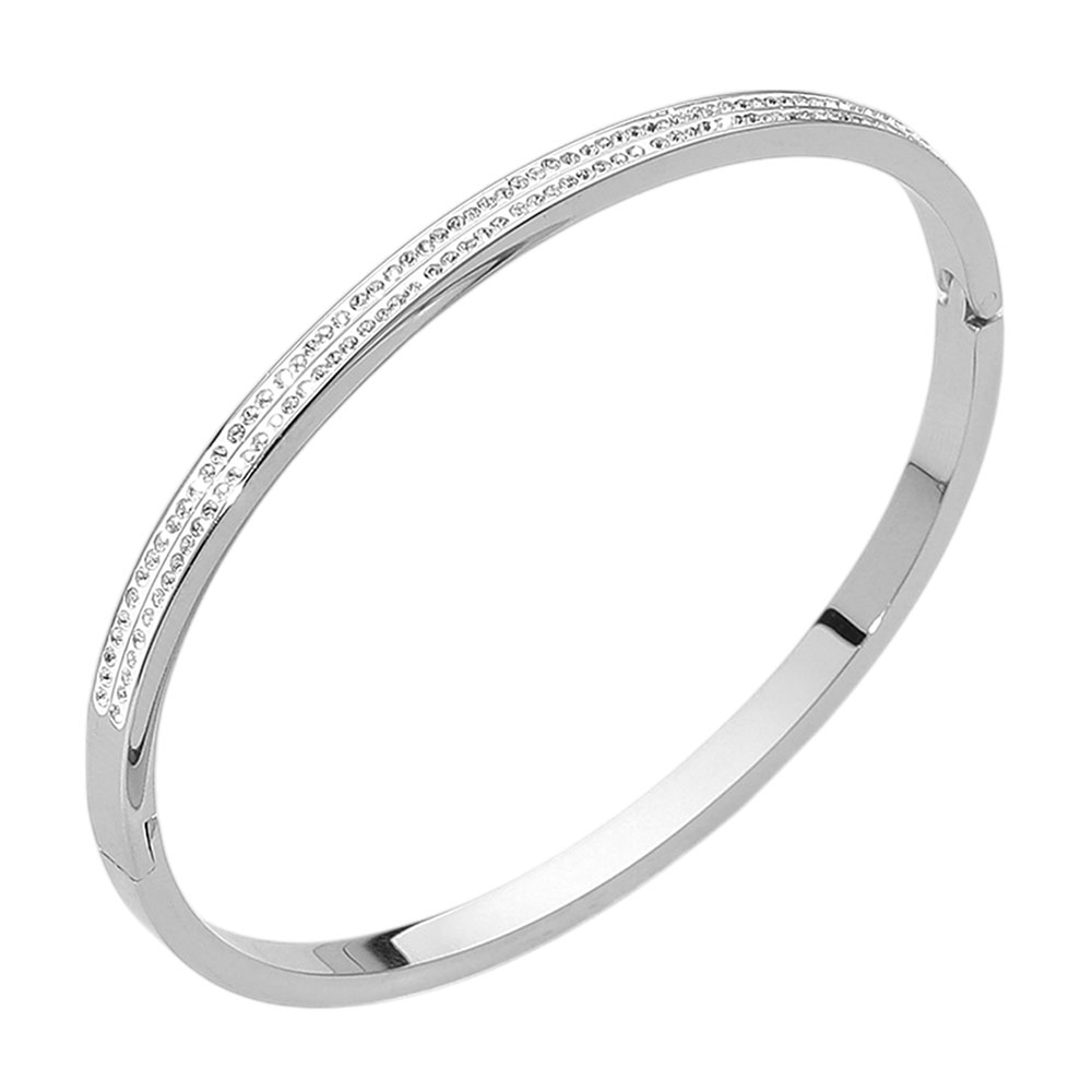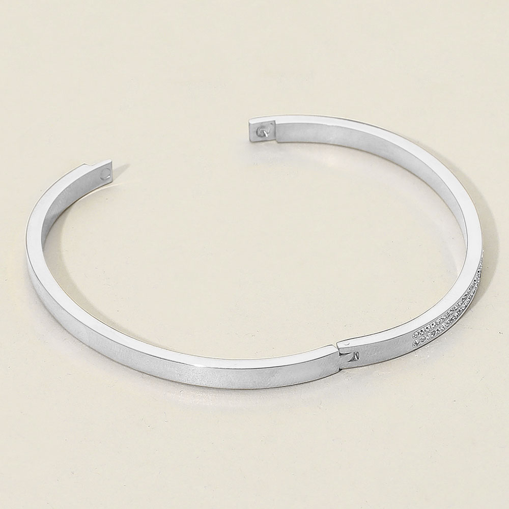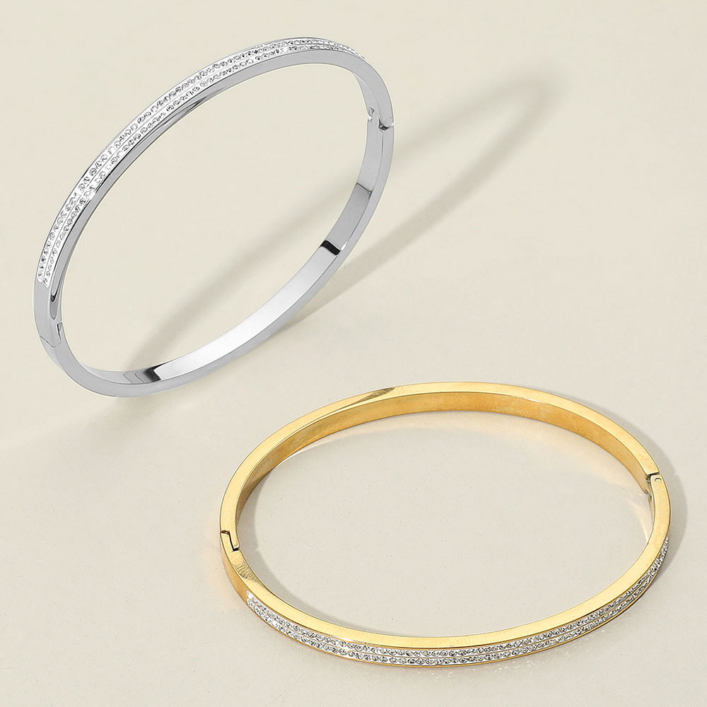 • Minimalist hinged bangle bracelet with double-row pavĂ© rhinestone accents. A refined accessory perfect for layering or solo wear, ideal for both casual and formal outfits.
