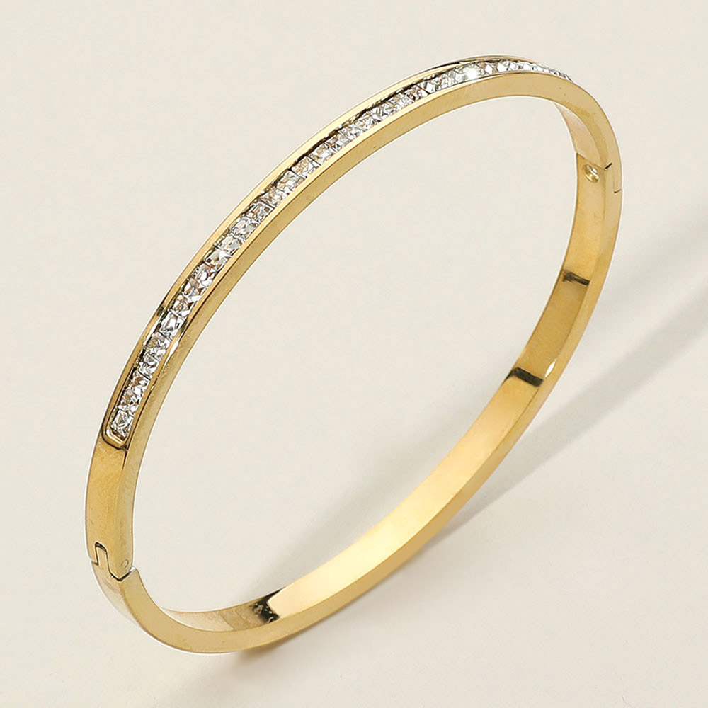 Details • Size : 0.2" H, 2.4" D • Hinged Closure • Water Resistant • Sleek hinged bangle bracelet with a row of sparkling rhinestone accents. Classic and elegant design perfect for stacking or wearing solo to add a refined touch to day or evening looks. • Stainless Steel