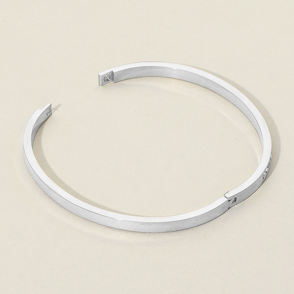 Details • Size : 0.2" H, 2.4" D • Hinged Closure • Water Resistant • Sleek hinged bangle bracelet with a row of sparkling rhinestone accents. Classic and elegant design perfect for stacking or wearing solo to add a refined touch to day or evening looks. • Stainless Steel