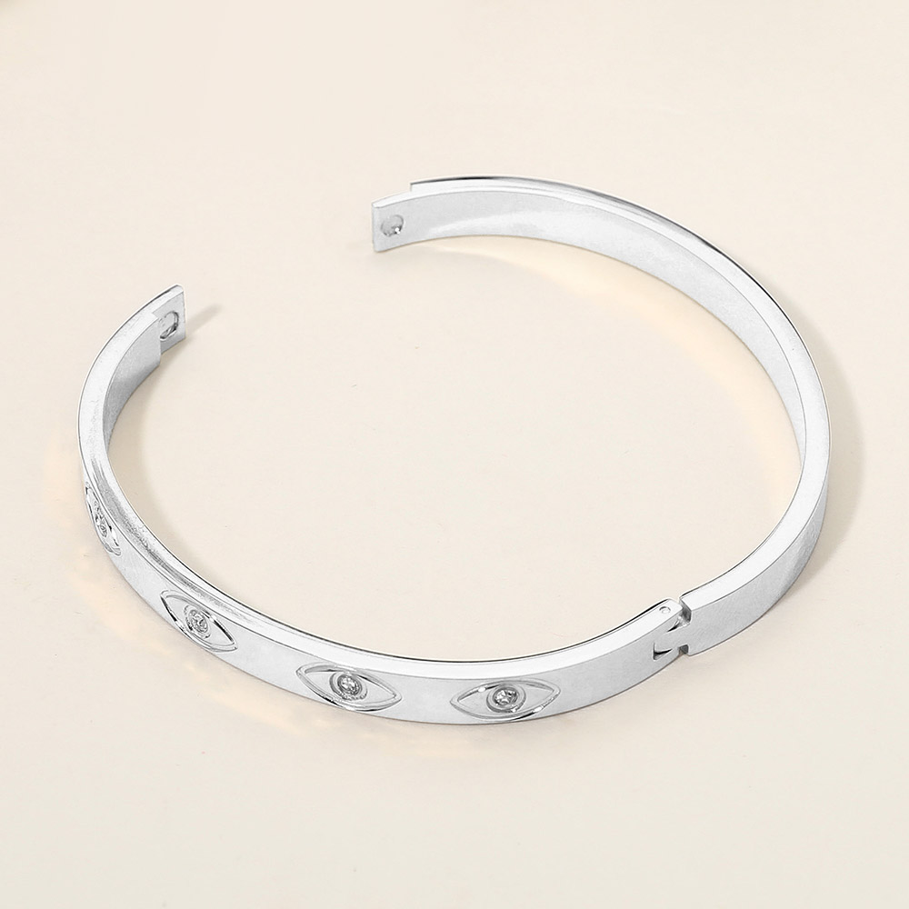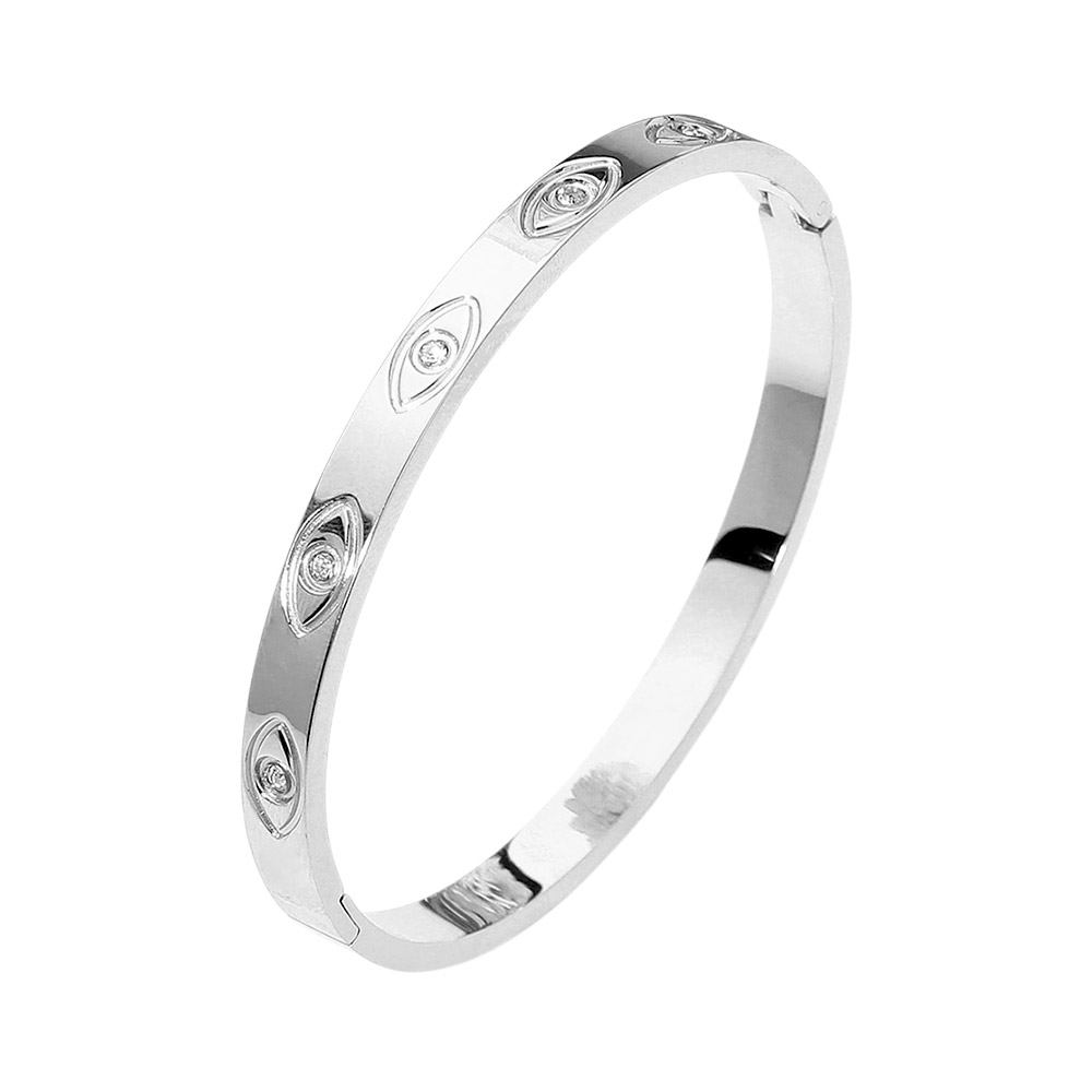 Details • Size : 0.25" H, 2.4" D • Hinged Closure • Water Resistant • This evil eye engraved bangle bracelet features sparkling crystal accents set in a sleek design, perfect for adding elegance to any outfit. With its timeless appeal and refined details, it’s a versatile accessory that enhances both casual looks and evening styles effortlessly. • Hypoallergenic • Stainless Steel